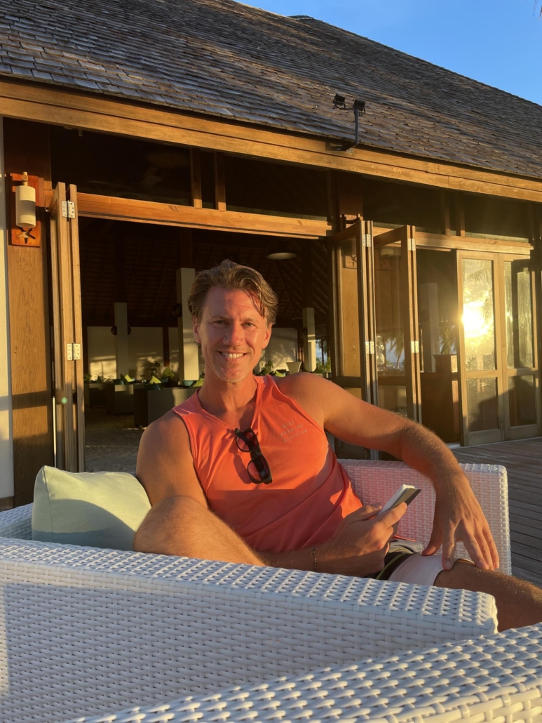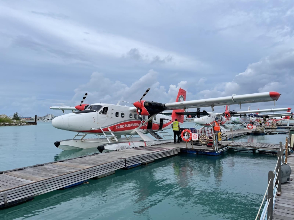 Nachdem der Stempel schließlich von dem sehr engagierten Grenzbeamten förmlich in den Reisepass gewuchtet wird, geht es anschließend dafür umso schneller. Koffer, Ausgang, Transfer zum Terminal für Wasserflugzeuge. Alles flutscht ohne Probleme. In dem Wartebereich für den Weiterflug kann ich das erste Mal meine Gedanken sortieren. Es ist lustig: Da war ich so oft und viel in der Welt unterwegs, zigmal in der Karibik und dann kommst du schließlich genau dorthin, wovon du seit 25 Jahren hörst und liest. Quasi so etwas wie unsere damalige Konkurrenz-Destination. Natürlich ist das kein echter Wettbewerb, aber ich habe logischerweise schon oft verglichen und mir eben oftmals gewünscht, dass unsere Karibikhotels auch so ein beeindruckendes Foto aus der Luft hätten, wie es sicherlich jede Malediveninsel hat. Dazu gibt es von dem Malediven unverschämt viele Bilder mit schräg über dem Wasser liegenden Palmen, die einfach nur perfekt aussehen. All dies war viele Jahre weit weg.
