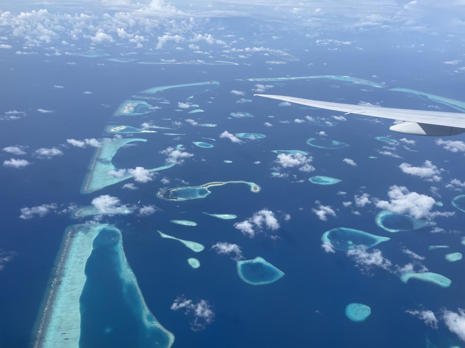 Langstreckenflüge haben oftmals etwas Tranceähnliches. Man schläft, liest oder schaut Filme. Sobald man sich allerdings den Malediven nähert, bricht im Flugzeug eine sehr außergewöhnliche Stimmung voller Euphorie aus. Ich meine, viele Regionen sehen aus der Vogelperspektive klasse aus und sicherlich hat jeder schon einmal den Anflug auf einen Flughafen gespannt verfolgt. Aber wenn man die ersten Malediveninsel erspäht, ist die Wirkung durchaus eine andere. Schließlich sieht man hier ja keine Verwaltungsgebäude oder Autobahnauffahrten, sondern Trauminseln. Die Nachricht, DASS jemand eine solche Insel entdeckt hat, verbreitet sich im Flieger in Windeseile! So schnell kann man den Tomatensaft gar nicht beiseitestellen, da hat auch schon jeder mit Sitzplatz A oder K seinen Blickschutz aufgerissen und versucht einen Blick auf das Inselparadies zu erhaschen. So auch ich! Die weißen Farbklekse im tiefen Blau des Ozeans haben allerdings auch wirklich etwas Magisches. EINE solche Insel ist ja schon aufregend, aber Inseln so weit das Auge reicht, ist nochmal eine ganz andere Nummer. Ich schaue wie gebannt auf das sich unter mir nähernde Paradies und bin mehr als fasziniert. Pure Schönheit.