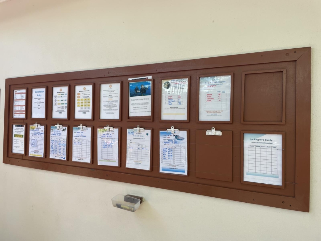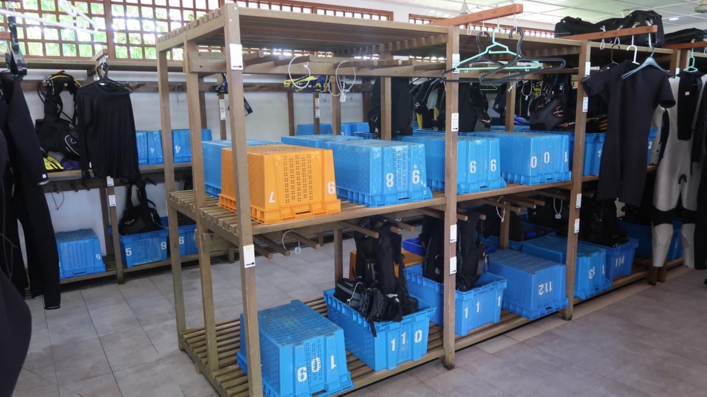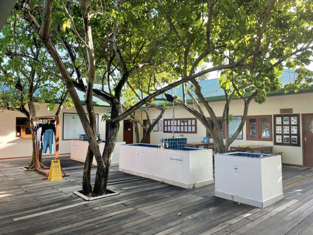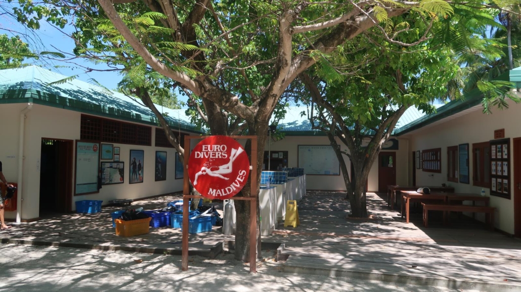 Dementsprechend hat jede Malediveninsel eine Tauchbasis und diese hier auf Vilamendhoo ist im obersten Regal zu finden. Die Eurodivers haben eine sehr gute und extrem professionelle Tauchbasis etabliert, die vollkommen zu Recht ein prima Standing bei den Tauchern genießt. Es gibt einen großen Trockenraum, viele gut zugängliche Waschbecken, einen tollen Service, bei dem das Equipment immer aufs Boot und vom Boot zur Basis zurückgebracht wird (rund um COVID-19 war ein Waschen des kompletten Equipments nicht möglich, aber ansonsten steht den Gästen wohl auch dieser Service zur Verfügung), eine übersichtliche Tauchplatzkarte und eine Liste für die verschiedenen Tauchausfahrten der kommenden Tage. Hier kann man sich je nach Wunsch und Laune eintragen, wobei natürlich auch immer beschrieben wird, wohin es geht und welches Level man „mitbringen“ sollte. Wie man sich nicht anders denken kann, sind vor allem die besonderen Ausfahrten zu den Manta-, Walhai- und Hai-Tauchplätzen besonders beliebt! Und damit wären wir auch direkt beim Thema…