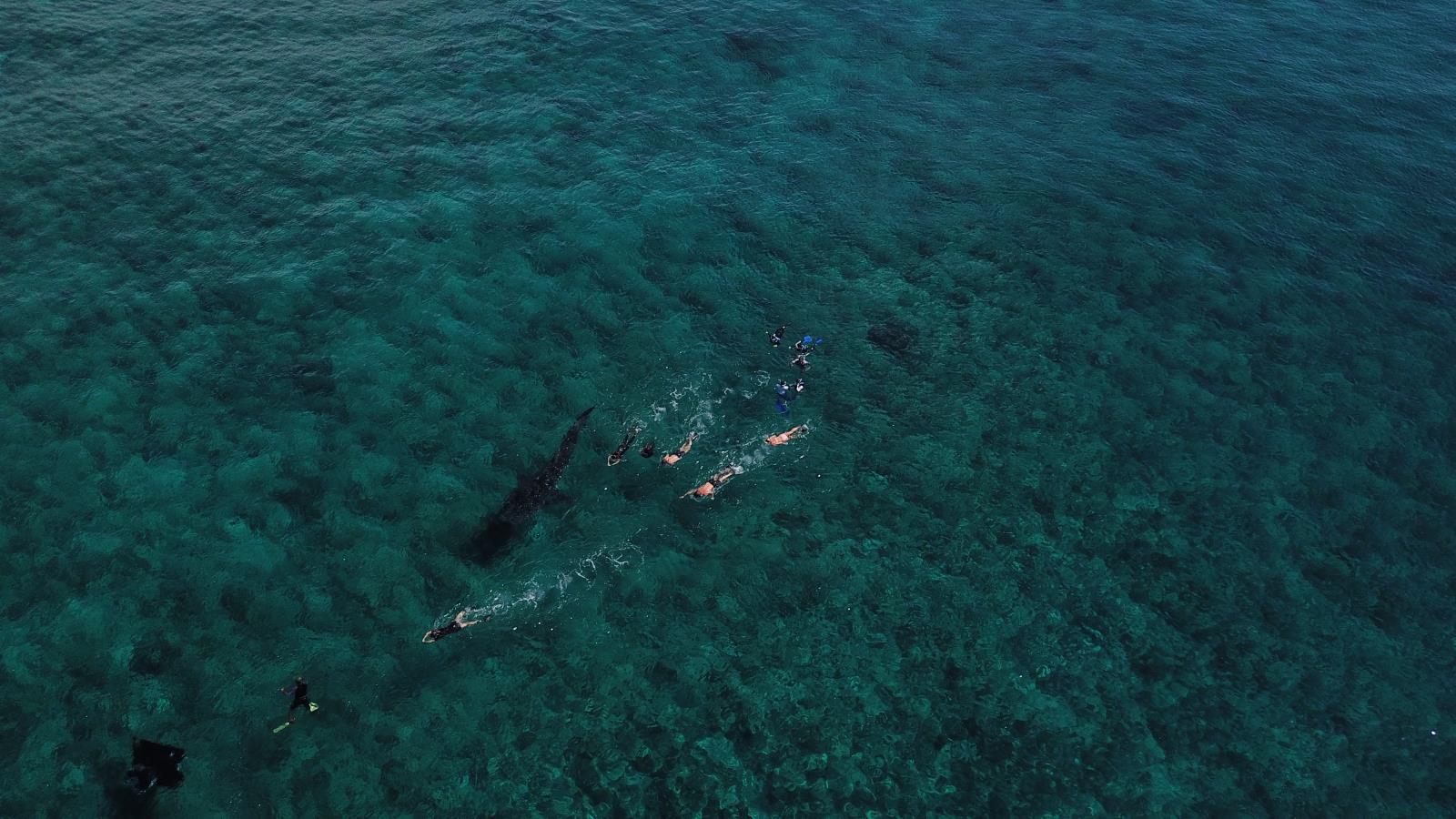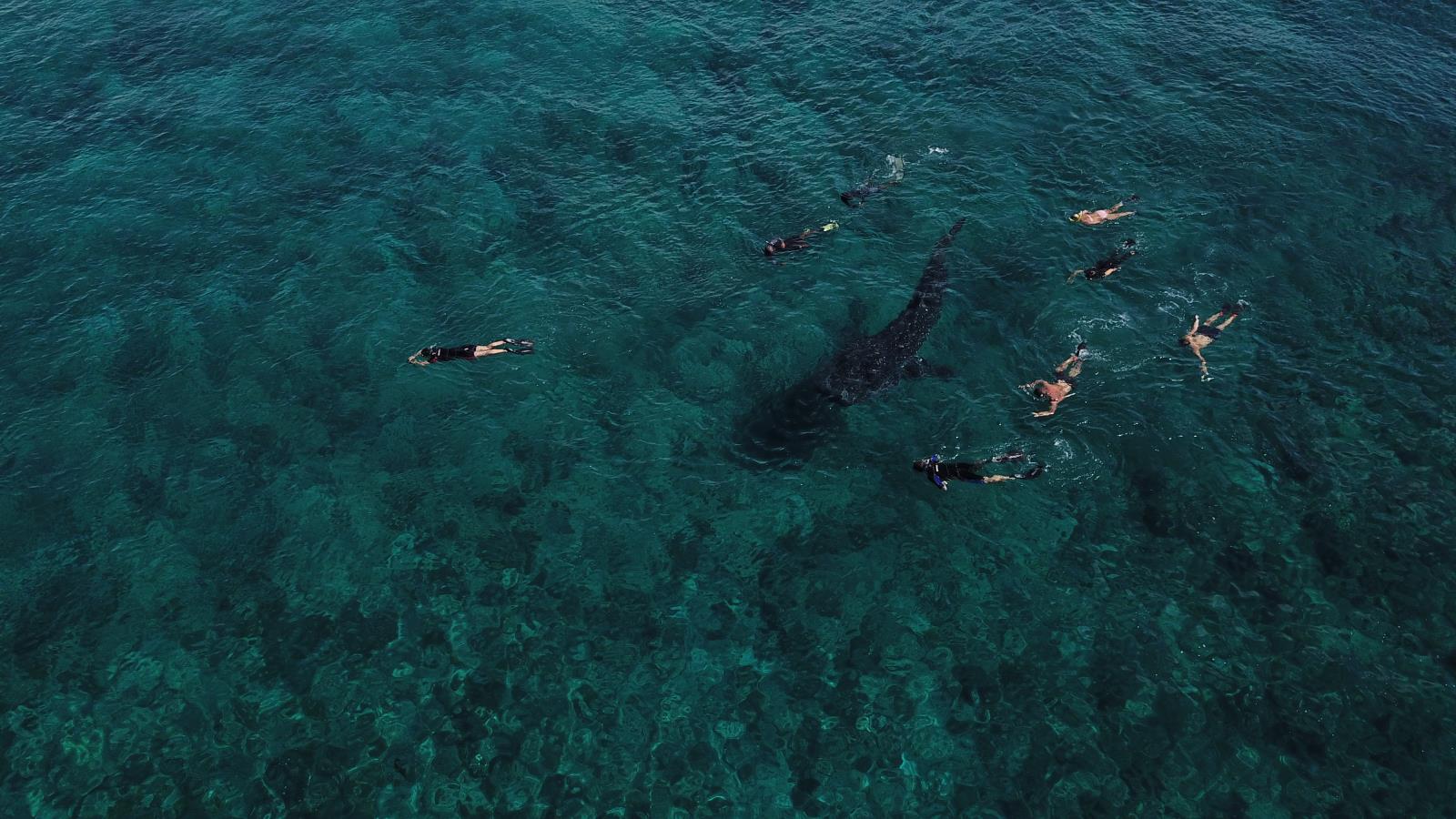Kaum, dass wir ums Eck der vorgelagerten Insel und im offiziellen Teil des Nationalparks sind, geht es plötzlich ganz schnell. Rufe und Hektik! Ein Walhai. Und wir sind als erste da. Keine anderen Boote. Klares Wasser. Sonnenschein. Alle schnallen schnell das Schnorchelequipment an und versuchen ihr Glück. Ich entscheide mich für die Drohne, denn eine bessere Gelegenheit für einen Walhai von oben werde ich wohl nicht mehr bekommen. Die Sonne scheint, das Wasser funkelt. Das ist meine Chance. Und tatsächlich werde ich mit ein paar tollen Aufnahmen belohnt, während sich einige andere Boote dem Walhai nähern. Unsere Schnorchelgruppe kommt wieder an Bord. Einige haben den Walhai verpasst, dafür aber einen Manta gesehen! Verrückte Welt. Aber ein durchaus fairer Tausch. Als ich meine Bilder und Videos sichte, fällt mir zunächst gar nicht auf, was ich für ein Glück hatte. Auf einem Bild habe ich nämlich tatsächlich den Walhai UND den Manta erwischt. Unabsichtlich. Was für ein Schuss!!!