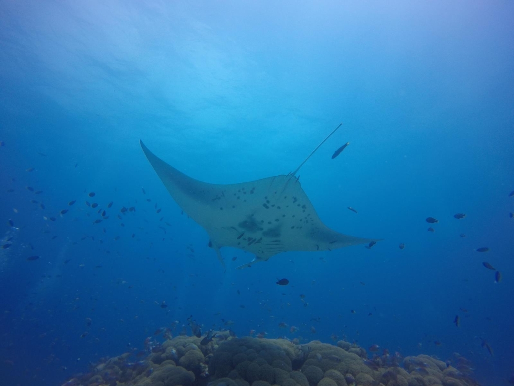 Taucherisch ist leider zu sagen, dass die Korallenlandschaft teilweise schon erschreckend bleich ist. Auch das hatte ich im Vorfeld gelesen und gehört, aber live sieht es nochmal etwas bedrückender aus. Solche Bilder kenne ich von der Karibik quasi gar nicht. Aber seien wir ehrlich, ich war wegen der Großfische hier und diese habe ich gesehen. Mehr und besser, als ich es mir erhofft hatte. Den Manta-Tauchgang habe ich übrigens auch nochmal ein zweites Mal mitgemacht und auch dieser war erfolgreich. Nicht wie geplant, denn bei dem eigentlichen Manta-Spot, von dem ich oben erzählt habe, hatten wir Pech und es gab nichts zu putzen, aber bei einem weiteren erfolgsversprechenden Tauchplatz hat sich dann erneut ein wunderschöner Manta blicken lassen.