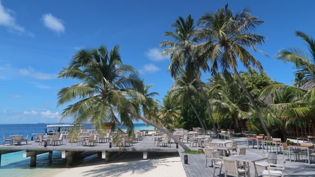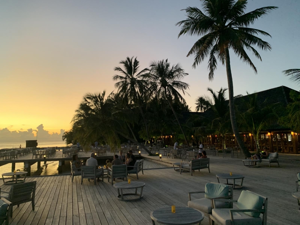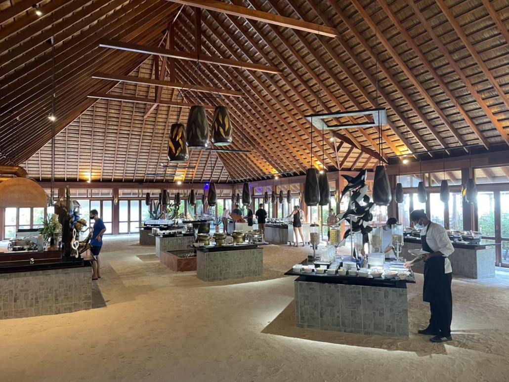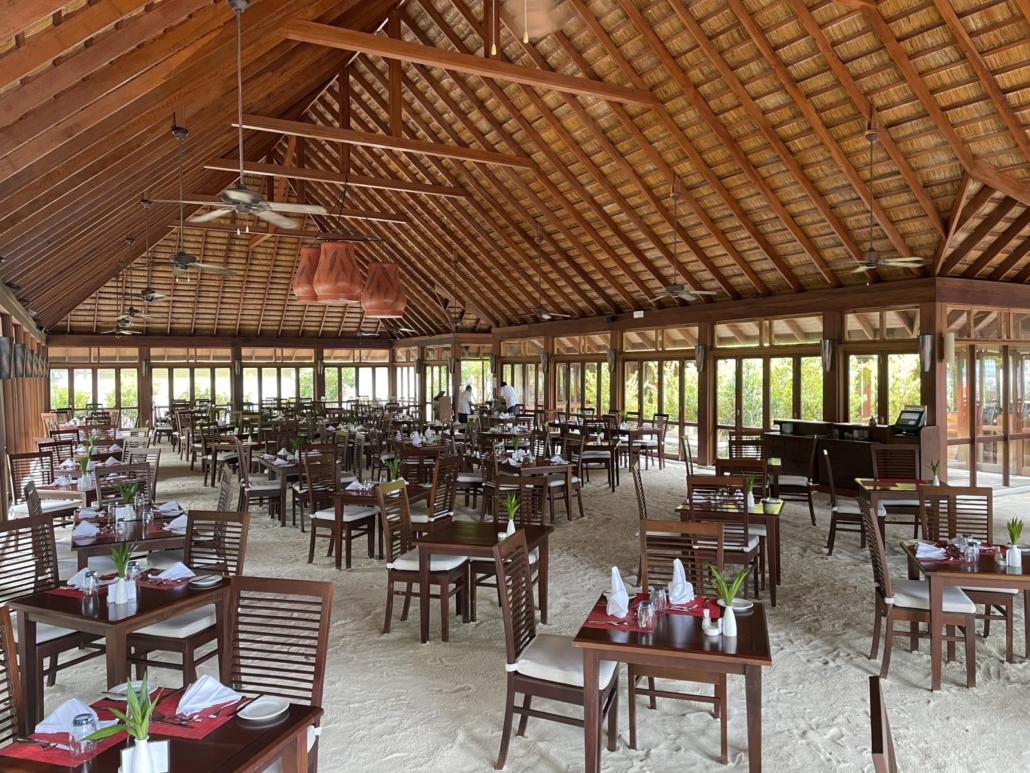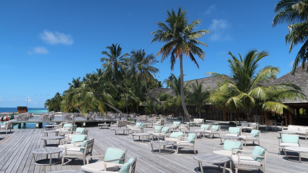 Was mir besonders gut gefällt, jedes Zimmer hat im Innenbereich des Restaurants einen festen Tisch, man kann aber zu jeder Mahlzeit entscheiden, ob man im Innenbereich bleiben oder nach draußen auf die Terrasse, wo die Tischwahl frei ist, wechseln möchte. Die Terrasse ist für mich irgendwie DER Eye-Catcher, denn mir gefällt das Arrangement aus Couches, Tischen und der Holzterrasse über dem Wasser einfach unglaublich gut. Dazu hängen hier und da – natürlich – ein paar Palmen immer mal wieder dazwischen schräg über dem Wasser. Was ist das hier nur mit den Palmen?? Speziell abends ist die Terrasse sehr beliebt, sowohl zum Entspannen, als auch fürs Abendessen selbst. Erwähnen möchte ich noch, dass sowohl der Restaurant-Innen- als auch der Buffetbereich natürlich einen Sandboden haben…