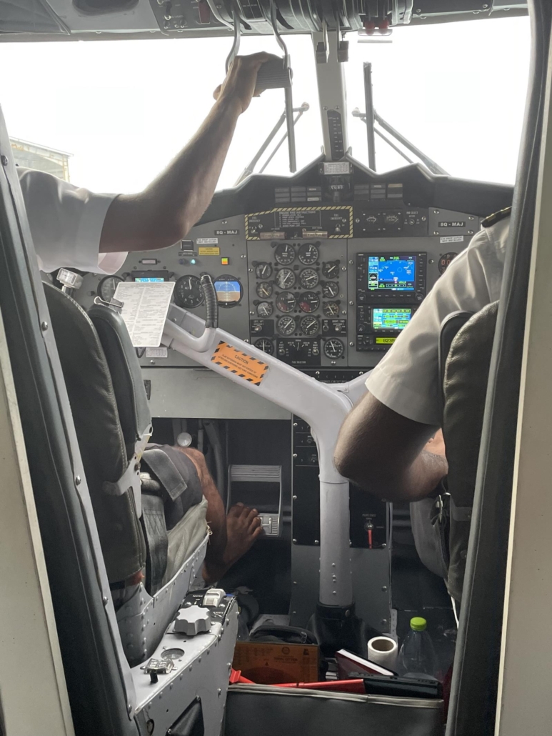 Nachdem sich alle Passagiere in das kleine Flugzeug gezwängt haben, schaltet der Pilot auch sehr zügig die Maschinen an. Der Zeitplan scheint straff zu sein – kein Wunder bei den vielen Inseln. Das Surren der Propeller ist hypnotisch und spannend zugleich. Der Puls steigt. Wie in einem Auto auf dem Supermarktparkplatz parken wir, inmitten der zahlreichen weiteren Flugzeuge, souverän aus und tuckern Richtung Runway. Auf dem Wasser logischerweise. Was schon irgendwie kurios bis ungewohnt ist. Der Pilot könnte Karibianer sein, so locker wie er sich in seinem Sitz fläzt. Ach ja, barfuß wohlgemerkt.