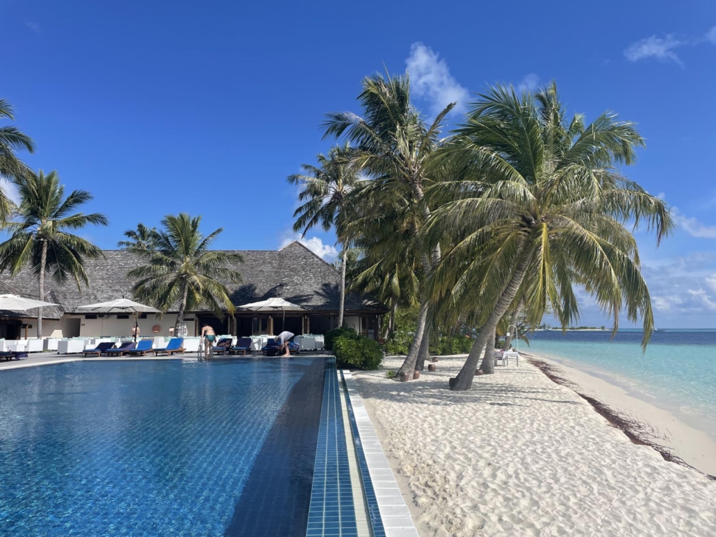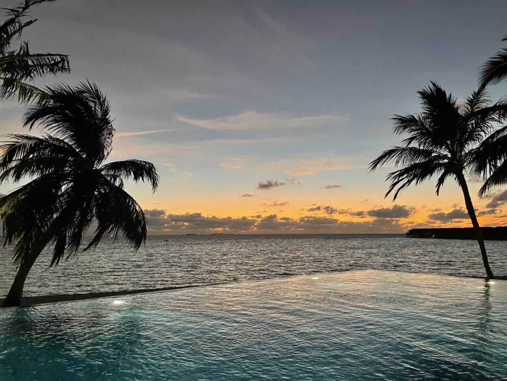Und dann gab es noch den Infinity-Pool! Ich weiß noch genau, dass ich bei der Planung viele Kommentare gehört habe, wie zum Beispiel „einen Pool brauchst du eh nicht, das Meer ist doch rundherum“, aber ich will ehrlich sein: nachmittags, nach dem Tauchen, mal so am Pool zu liegen, einen Mango-Milchshake zu bestellen, um dann vorne an der Poolkante aufs Meer zu schauen, hat schon etwas… Der Strand ist zwar wirklich lächerlich schön, aber die Möglichkeit ab und zu mal auszuweichen und vom Pool aus den Sonnenuntergang zu beobachten, hat man jetzt auch nicht zwingend jeden Tag…