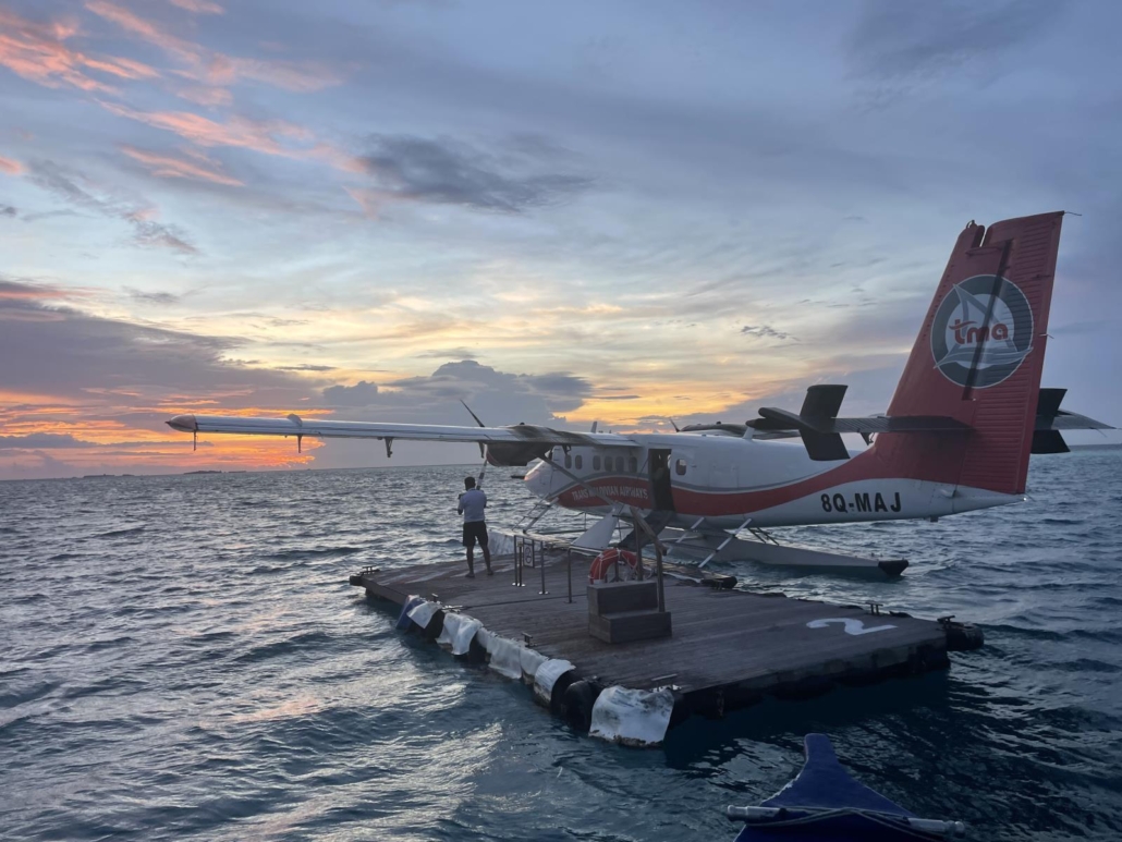 Die Landung ist dann ebenfalls kurz und dabei erstaunlich gefühlvoll. Wasser kann ja bekanntlich auch mal hart sein, siehe der 5-Meter-Turm im Freibad, in diesem Fall setzen die Schwimmer des Flugzeugs aber sanft auf der Oberfläche auf. Der für mich lustigste Teil ist dann, dass alle Gäste für die gerade angesteuerte Inselgruppe auf einem eigens für das jeweilige Hotel eingerichteten Ponton ausgesetzt werden. Ein kleines Floß als Terminal mitten im Meer, sehr süß. Nachdem die Sonne gerade dabei ist zu verschwinden, könnte das Bild nicht schöner sein.