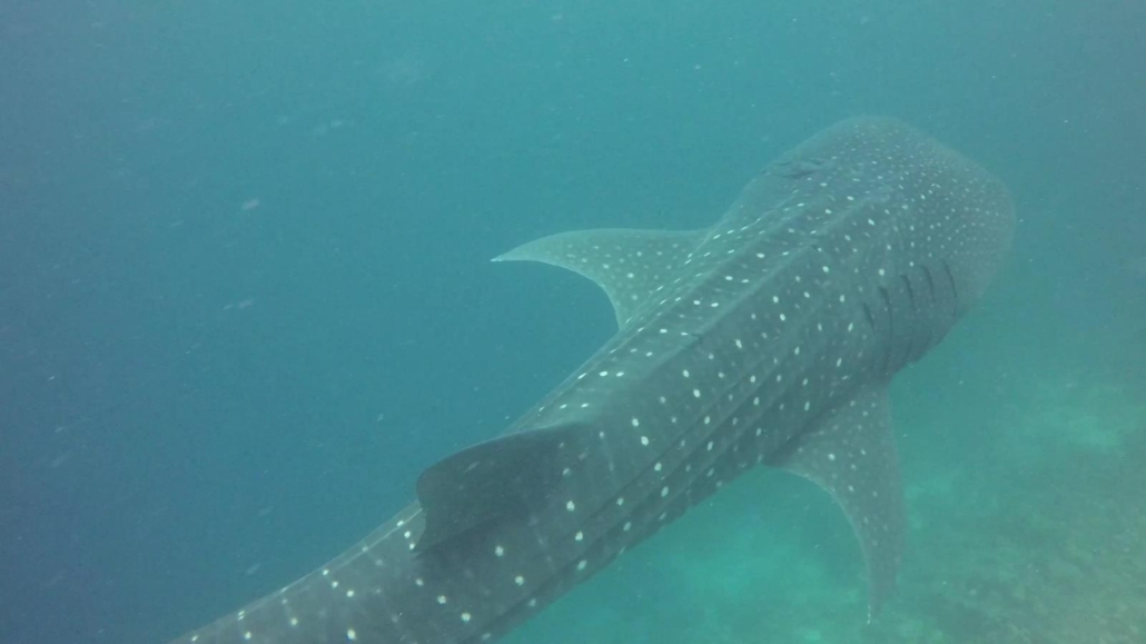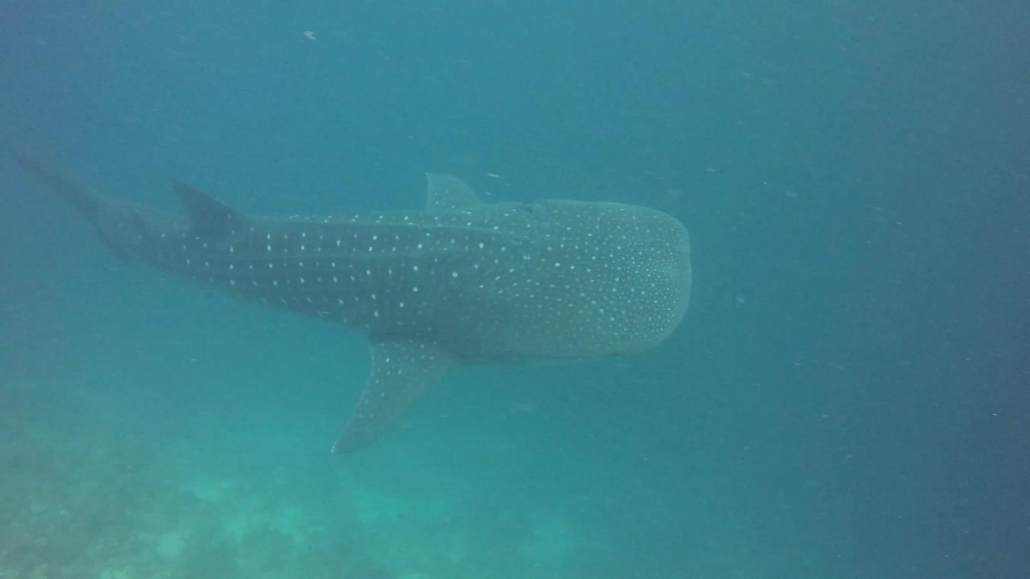 Da kommt er. Der gefleckte D-Zug. Oder sagt man heutzutage ICE? Egal. Der Walhai kommt. Die weißen Flecken auf seinem zarten Grau kündigen ihn charmant an. Die breite Schnauze. Meine Güte ist der groß. Das Gefühl ist unfassbar. Der Walhai, das Tier über das man so viel redet. Wir in der Tauchbranche sprechen jeden Tag über Walhaie. Jeder Taucher will ihn sehen. Den Walhai. Und er ist direkt vor mir. Nicht beim Schnorcheln, sondern beim Tauchen. Ab da geht es schnell, denn er rauscht an mir vorbei. Aber ganz langsam. Irre. Vielleicht ist er doch eher ein Bus. Ich habe diese Szene wirklich jetzt noch beim Schreiben dieser Zeilen genau vor mir. Die weißen Punkte. Sie sollen ihn tarnen, machen ihn dabei aber so einzigartig. Sie sind nun ganz klar unter mir. Auch das Gefühl von diesen Sekunden kann ich immer noch nachfühlen. Das löst eben die Begegnung mit einem Walhai aus… Als erstaunlich lang empfinde ich den Übergang von seiner großen Rückenflosse bis zum Ende, also der Schwanzflosse. Da merkt man erst die ganze Länge, die Größe, die Wucht, dieses faszinierenden Tieres. Und dann eben die besagte Schwanzflosse. Sie wedelt. Sie wackelt von links nach rechts. Die Amplitude ist groß, sehr groß. Die Guides haben beim Briefing noch gesagt, dass man genau aufpassen muss, denn eine Ohrfeige eines Walhais sollte man sich nicht unbedingt einfangen. Ich genieße dieses Finale. Der Walhai winkt auf seine ganz persönliche Art zum Abschied. Mach’s gut, Großer. Laut meinem Video hat die Begegnung genau 1.05 Minuten gedauert. Was ja eh schon lange ist. Wobei irgendwie auch nicht. Jedenfalls kam sie mir vor wie zehn Minuten. Speziell der Moment, als ich seine beiden Rückenflossen quasi direkt vor mir hatte und ich die Feinheiten seiner Haut sehen konnte. Was für ein Erlebnis.