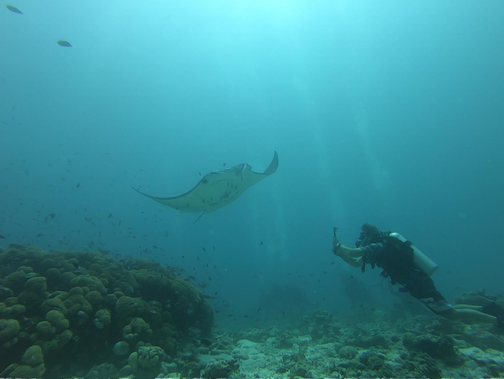 Dann werden es drei. Ich muss mich darauf konzentrieren, die Mantas auch mal direkt anzuschauen und nicht nur meine Kamera im Blick zu haben. Je mehr es werden desto größer werden sie gefühlt. Unbeschreiblich. Die Verwirbelungen, die ihre Flügel herstellen, sind einzigartig. Es ist die pure Schönheit. Vor allem, weil ich sie so richtig bewundern kann. Ich kann ihre Bewegungen genau beobachten und den Moment perfekt genießen. Besser geht es nicht. Alles was danach kommt, ist reines Vergnügen, lockeres austauchen, die Bootsfahrt genießen und die Gedanken sortieren. Ich habe wirklich meinen großen Tauchertraum erfüllt. Und es war wunderschön… Der Manta und ich. Wobei, es waren ja sogar drei. Noch besser. Ich hätte es mir nicht magischer wünschen können.