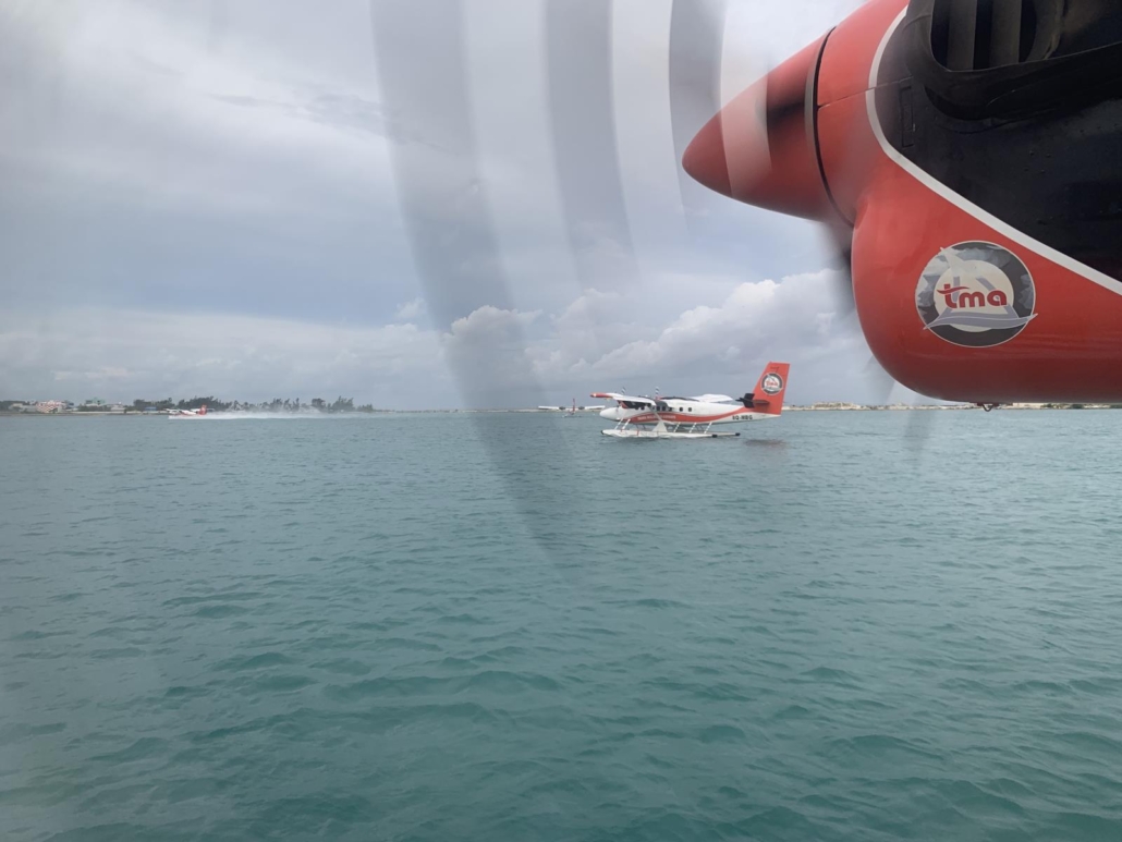 Die Aussicht ist, wie könnte es anders sein, überwältigend. Aus dem Langstreckenflieger war es ja schon atemberaubend, aber jetzt aus kürzerer Distanz wird es noch realer. Wir überfliegen mehrere Inseln, eine schöner und kitschiger als die andere. Strände, Palmen und Wasserbungalows, wie in einer Instagram-Story. Wer hier in sein Handy schaut, hat wirklich den Knall nicht gehört. Ich kann meinen Blick nicht von der bezaubernden Szenerie losreißen und genieße jede Sekunde.