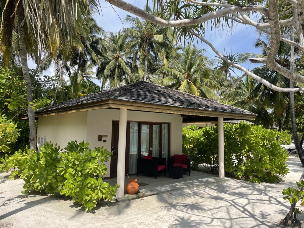 Bei den beiden Bungalows „an Land“ ist es so, dass man schon sagen muss, dass diese jetzt nicht weit voneinander entfernt sind, sondern die Abstände sind nicht wirklich groß. Ich will mit diesem Hinweis nur vorbeugen, damit man nicht denkt, bei einem freistehenden Bungalow sei man nur für sich. Dem ist nicht so. ABER, das stört gar nicht. Jeder dieser Bungalows hat den Strand – mal etwas mehr, mal etwas weniger – direkt vor der Haustür! Dazu gibt es zwei Sonnenliegen, so dass man quasi seinen eigenen Strandbereich „bekommt“! Was, wie ich finde, absolute Weltklasse ist. Zudem verfügt jeder Bungalow über eine eigene Terrasse, die auch seinen Mehrwert hat.