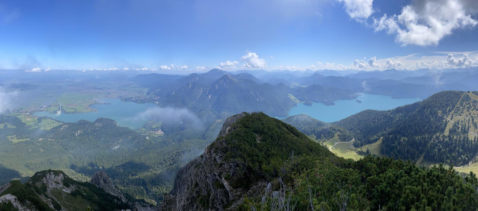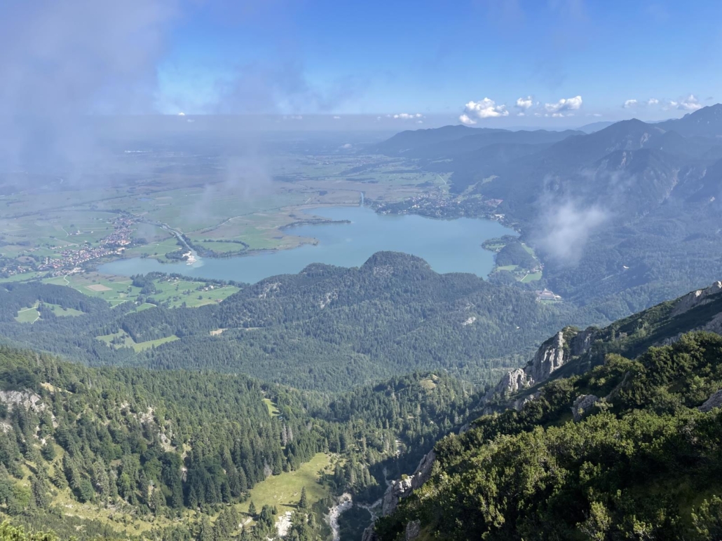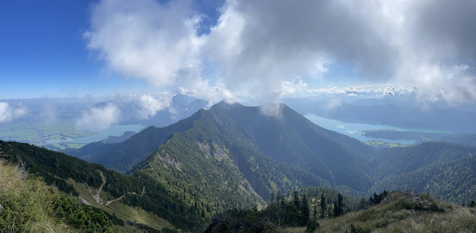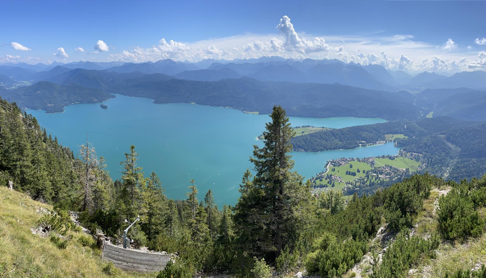 Von hier öffnet sich der legendäre Blick auf den Walchensee zu Füßen und den Kochelsee etwas weiter im Norden – eingerahmt vom Alpenvorland. Besonders bei klarem Wetter wirkt der Kontrast zwischen dem türkisblauen Walchensee und dem tiefer gelegenen, dunkleren Kochelsee spektakulär.