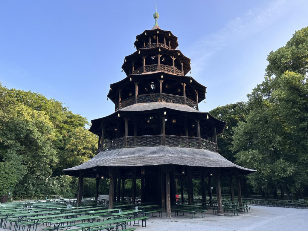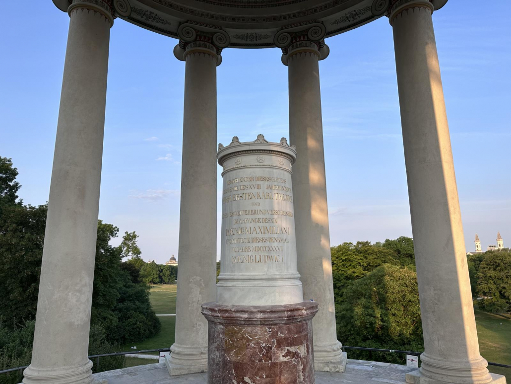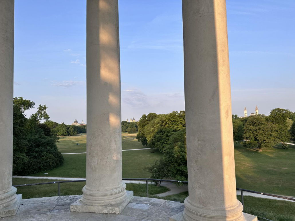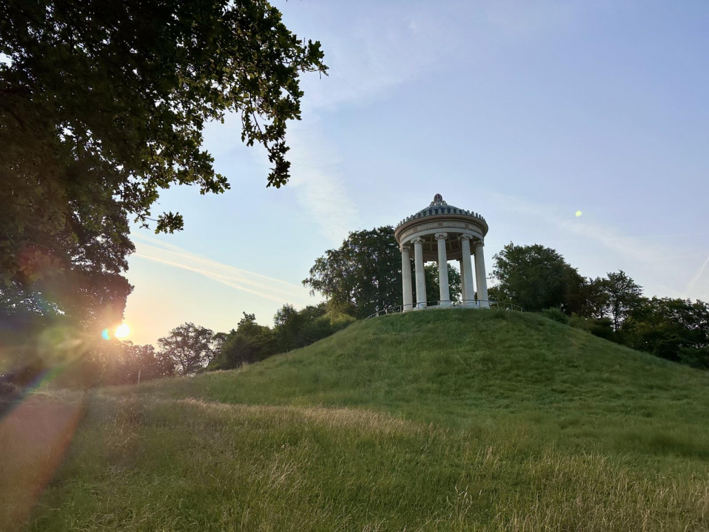 Vor allem früh morgens – mit der Sonne im Rücken, wenn noch nicht so viel los ist – ist der Ausblick auf Münchens größten Park natürlich phänomenal. Abends scheint die Sonne dann wunderschön auf den Tempel.