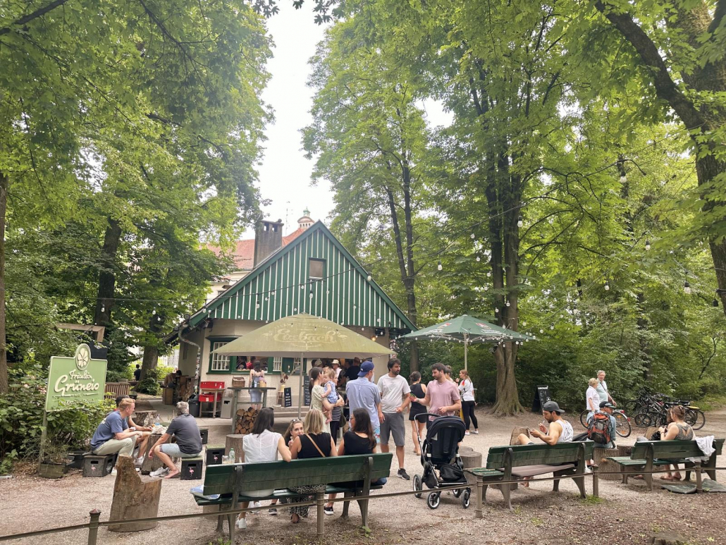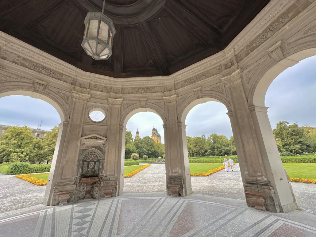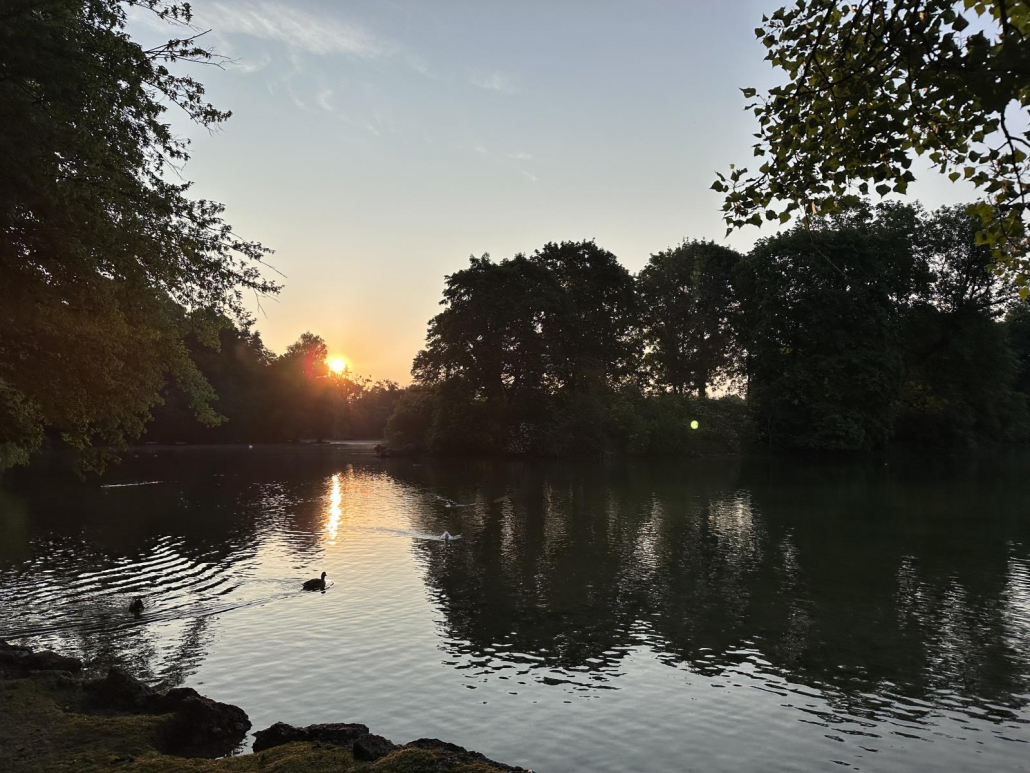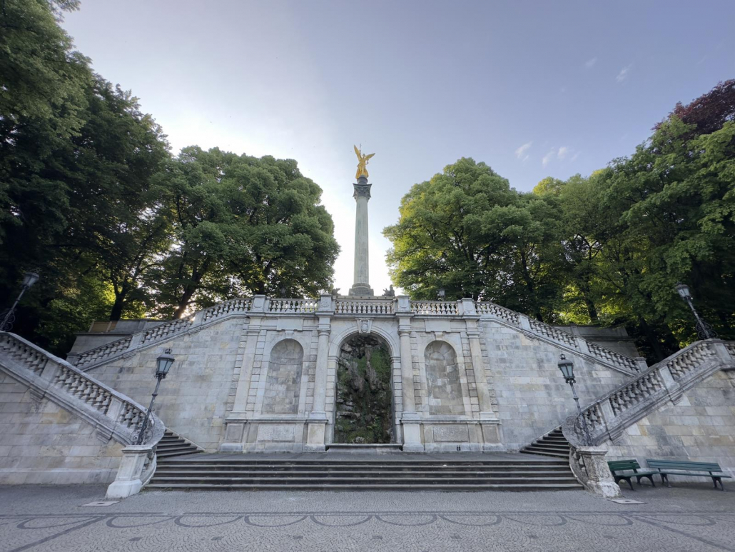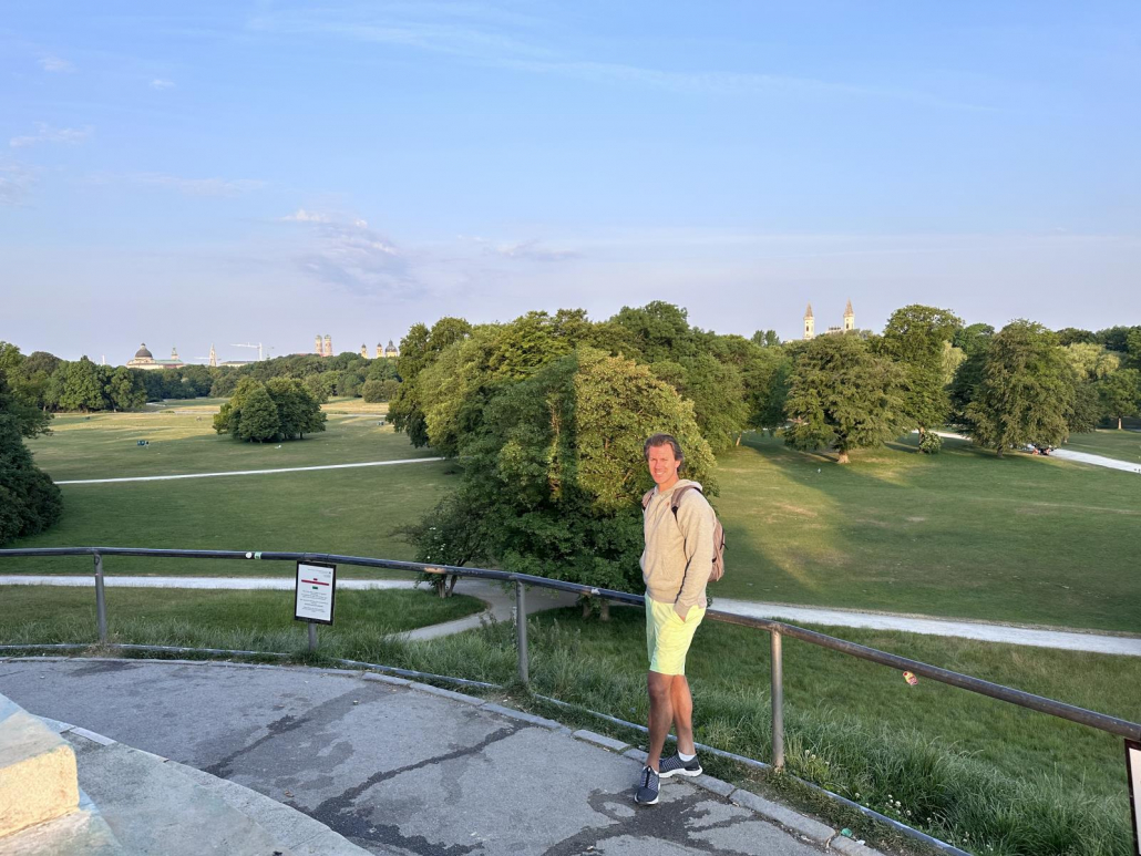 Vor allem früh morgens – mit der Sonne im Rücken, wenn noch nicht so viel los ist – ist der Ausblick auf Münchens größten Park natürlich phänomenal. Abends scheint die Sonne dann wunderschön auf den Tempel.