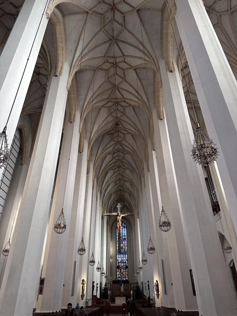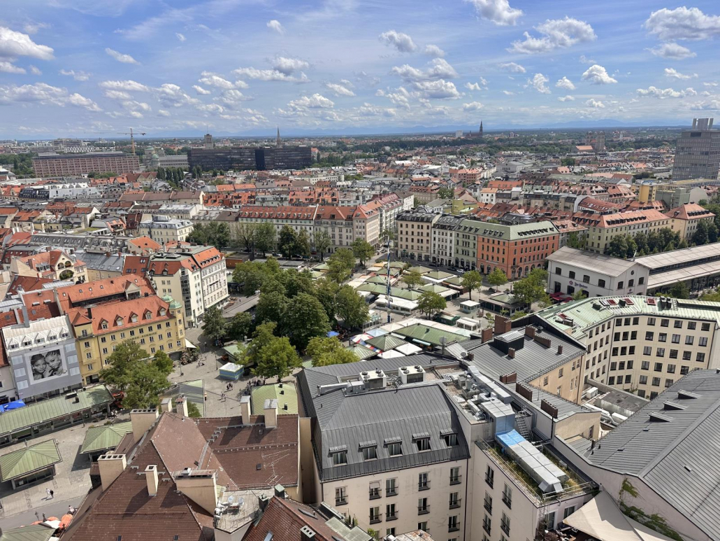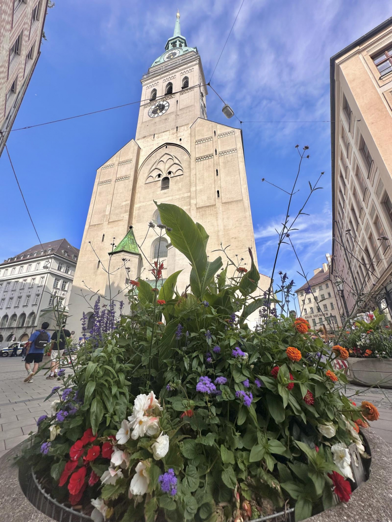 Die älteste Pfarrkirche Münchens (daher auch der Spitzname) verfügt nämlich über einen 91 m hohen Glockenturm und eine Besucherplattform auf 56 m mit einer großartigen Aussicht auf den Marienplatz, die Frauenkirche oder auch auf den Viktualienmarkt.