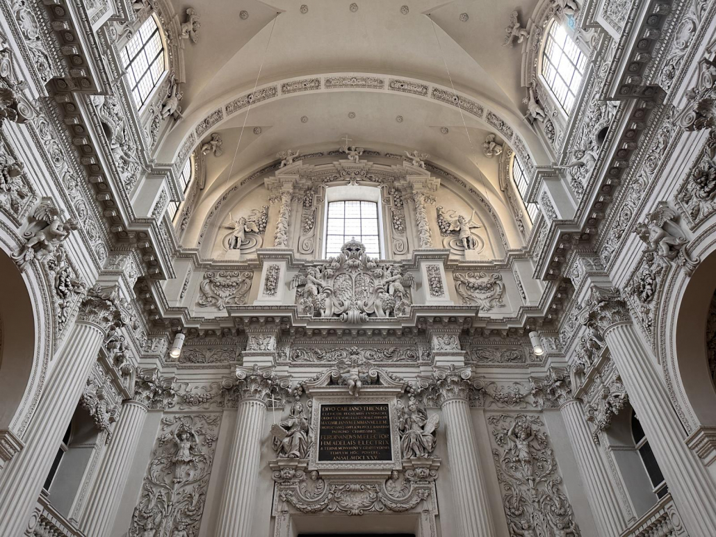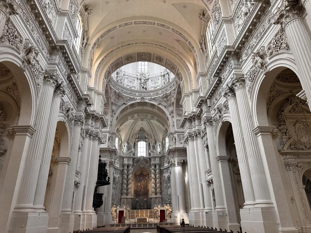 Der Innenraum ist dann fast überraschend schlicht und unaufgeregt. Mit einer Höhe von 37 Metern, den mächtigen weißen Pfeilern und den bunten Fenstern wirkt die Frauenkirche aber dennoch sehr beeindruckend. Immerhin finden hier bis zu 2.000 Menschen Platz.