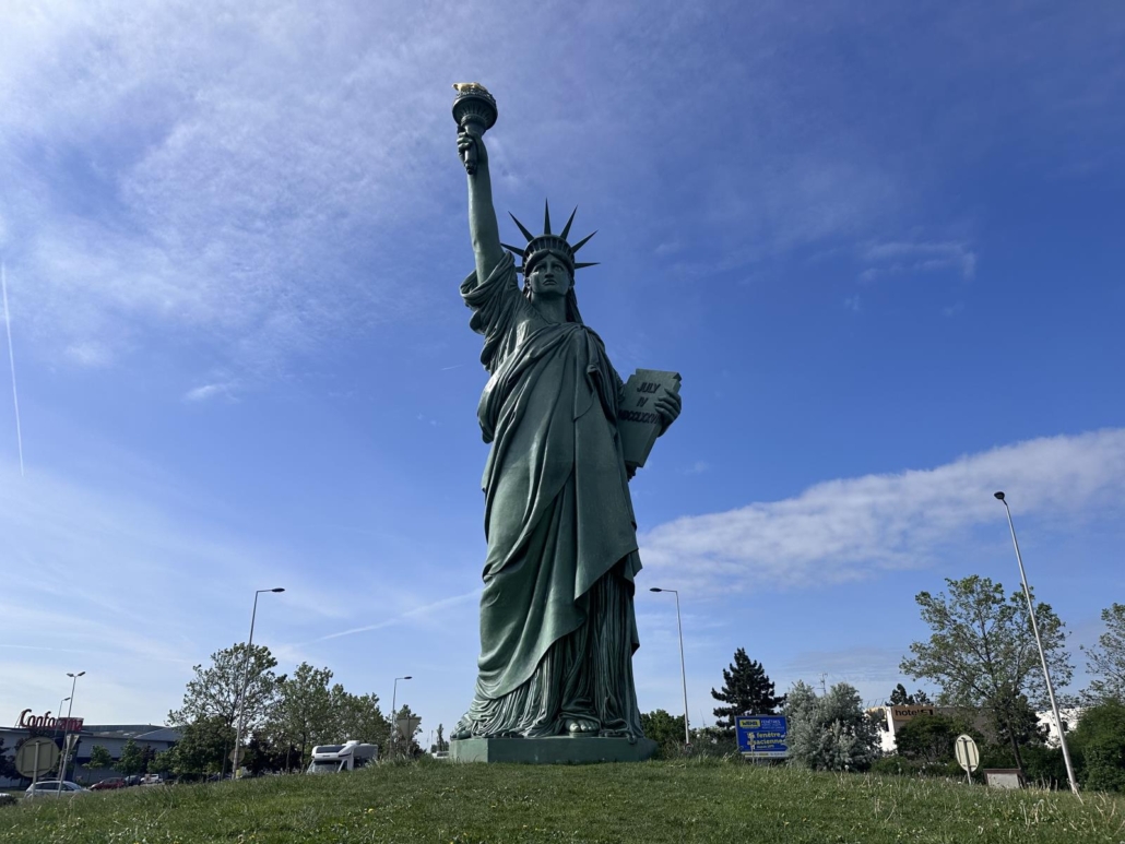 Der Künstler und Erfinder heißt Auguste Bartholdi und ist zweifelsohne das berühmteste Kind Colmars. Und um ihn entsprechend zu würdigen hat man eine 12m hohe Nachbildung aus Kunstharz an einem Kreisverkehr aufgebaut. Dieser befindet sich auf von Norden kommenden Route de Strasbourg.