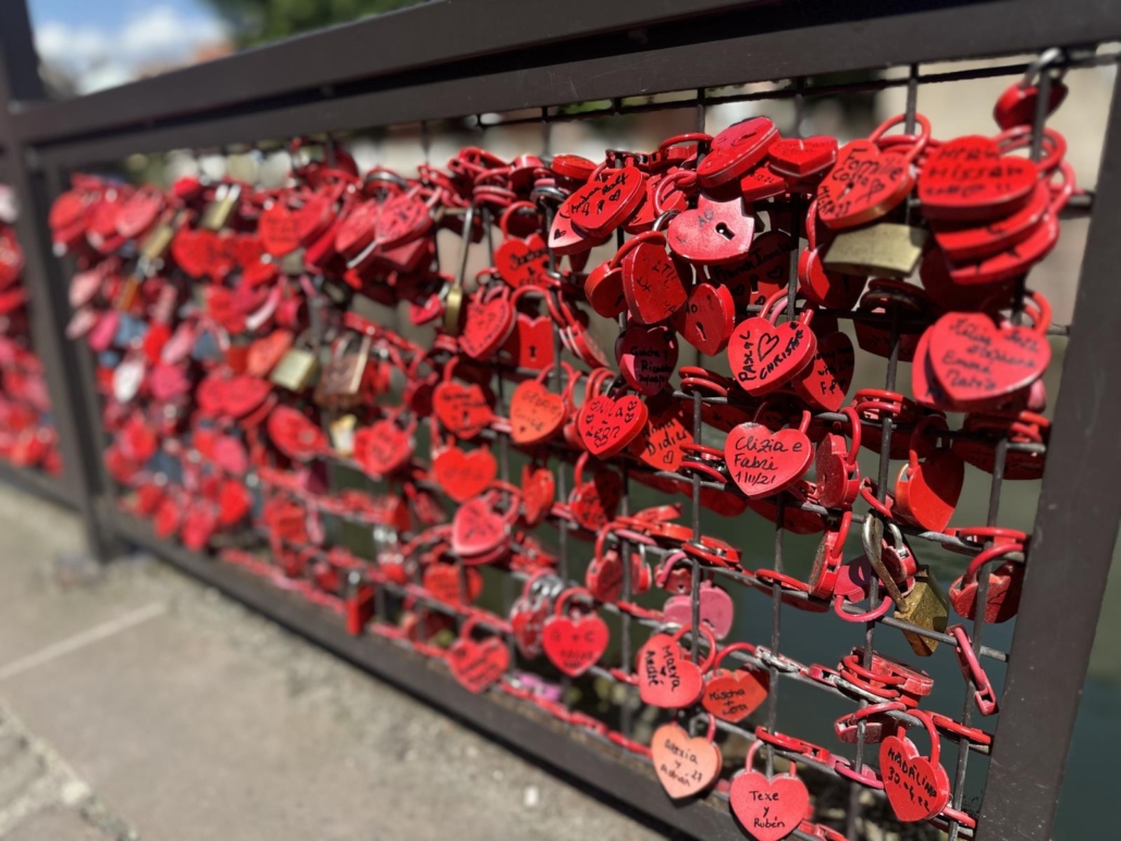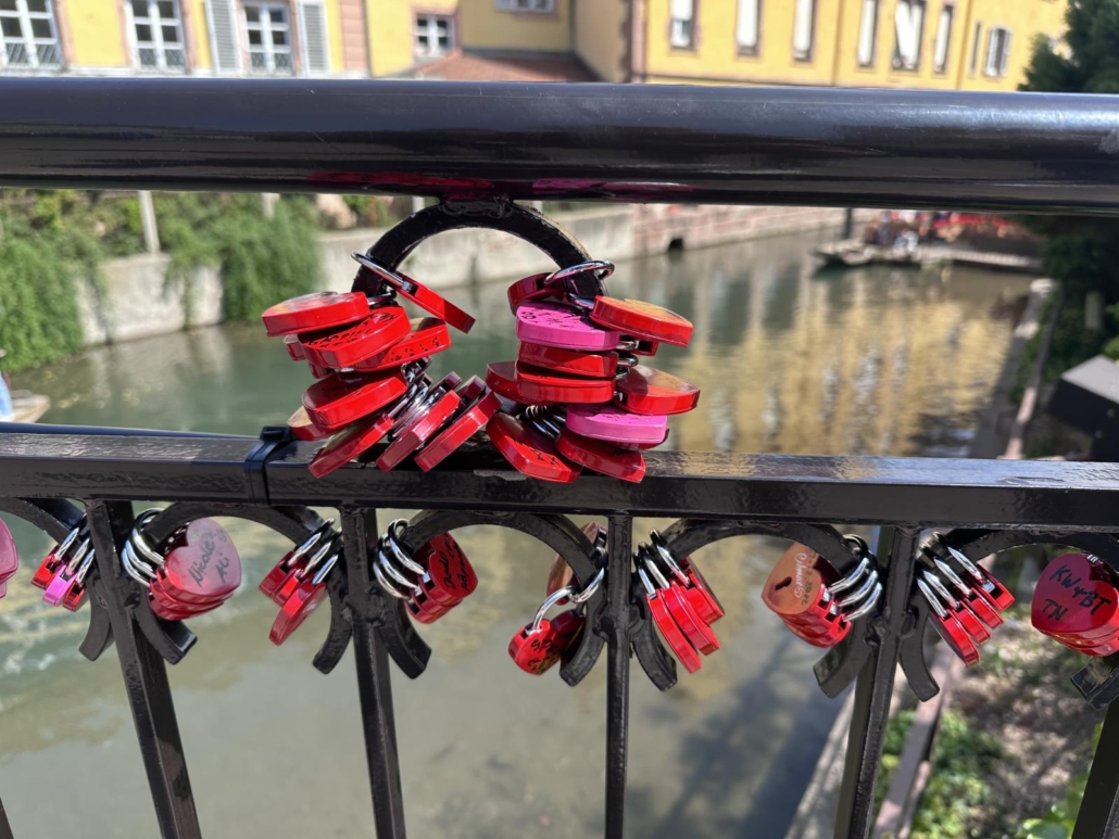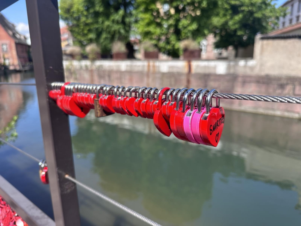 Dass Pärchen Schlösser an irgendwelchen Brücken als Zeichen ihrer Liebe befestigen ist natürlich nichts Neues. Aber in Colmar hat das Ganze eine andere Qualität, DENN es sind nicht irgendwelche Schlösser, sondern es handelt sich fast ausschließlich um rote Herzen. Diese kann man bei nahezu allen Souvenirshops in Colmar kaufen und so ergibt sich in vielen Bereichen ein ausgesprochen charmantes Bild. Zwei besonders schöne Bereiche sind an der Pont Rue des Ecoles und der Rue Turenne.