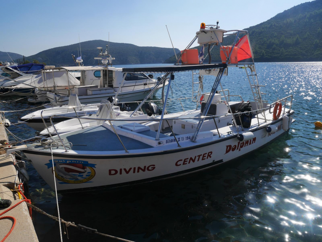 Insidertipps gibt es wie gesagt oft. Vor allem über Wasser. Unter Wasser wird das dann schon etwas schwieriger, denn Taucher sind Pioniere und scheuen das Unbekannte weniger als „normale Urlauber“. Ich möchte nicht so weit gehen und sagen, dass Kalamitsi taucherisch ein Insidertipp ist, denn das würde die Erwartung an die Qualität der Tauchplätze zu hoch schrauben, aber nach meinen bescheidenen Mittelmeer-Taucherfahrungen in Spanien, Malta, Italien, Griechenland und der Türkei möchte ich definitiv herausstellen, dass Kalamitsi in meinem persönlichen Ranking ganz weit oben landet. Und das hat mehrere Gründe. Zum einen ist die Tauchbasis Dolphin Dive die einzige in Kalamitsi. Vasilis kann jeden Tag aus dem Vollen schöpfen, denn er wird mit seinen Tauchern alleine sein, egal für welchen Platz er sich entscheidet. Ich liebe das! Es im Vorfeld schön zu wissen und macht außerdem die Anfahrt zum Tauchplatz schon zu einem Erlebnis, schließlich genießt man die vom Boot aus vorbeiziehende Landschaft ganz exklusiv. Dann kommt hinzu, dass Vasilis ein sensationeller Tauchguide ist, denn was er macht und plant, ist durchdacht und professionell. Wetter, Strömungen, Tauchlevel, Sichtweiten – all das bezieht er bei seinen Überlegungen welche Tauchplätze angefahren werden und mit wem er tauchen geht mit ein. Das klingt vielleicht selbstverständlich, ist es aber in der Praxis nicht, denn oft werden im Alltagsgeschäft vieler Tauchbasen dann doch wieder Anfänger mit Fortgeschrittenen zusammengewürfelt, um das Tauchboot zu füllen. Vasilis kommuniziert alles ehrlich und offen, fragt nach und möchte seine Taucher kennenlernen – das schafft Vertrauen. Vertrauen, das gerade bei Anfängern extrem wichtig ist. Würde ich meinen Tauchkurs nochmal absolvieren, ich würde mich sehr gerne in die Hände von Vasilis begeben. Und schließlich sind die Tauchplätze richtig, richtig gut. Unberührt, interessant und abwechslungsreich. Vasilis hat zwei Tauchboote, ein kleines Schlauchboot für die kurzen Ausfahrten rund um die Bucht von Kalamitsi, sowie ein größeres Tauchboot mit dem man komfortabel alle weiter entfernten Tauchplätze erreicht. Als wir aufbrechen und aus der Bucht herausfahren, ragen sofort wieder diese beeindruckenden Felsklippen in den Himmel. Aus der Vogelperspektive betrachtet stürzen sie ca. 200 Meter tief ins Meer hinab. Schon wieder komme ich mir vor, wie in einer Filmkulisse, denn der Pinienbewuchs mit den hellen Felsen würde jedem Fantasy- oder Abenteuerstreifen gut zu Gesicht stehen. Das Wasser ist ganz klar und man kann selbst vom Boot aus den tiefen Grund sehen. „Gute Sichtweiten, was? Das hat man hier sehr häufig“ lacht unser Kapitän Uwe, als er meinen verharrenden Blick ins helle Blau sieht. Die Tauchplätze sind ganz unterschiedlich, von flach mit Seegras und Korallen bis hin zu knackigen Steilabfällen mit artenreichem Bewuchs ist alles dabei. Die Wände und Felsen sind großflächig mit bunten Schwämmen und Federhaarsternen bewachsen. Röhrenwürmer und Schraubensabellen recken ihr filigranes Geäst ins klare Wasser. Ein massiger Zackenbarsch gesellt sich zu uns. Vor allem aber finden die Mönchsfisch-Schwärme meine Aufmerksamkeit. Zu beachten gilt aber, dass es immer mal wieder zu Strömungen kommen kann, gerade bei den Top-Tauchplätzen wie zum Beispiel der Felspyramide „Tower“. Die Überhänge dort fallen bis auf 45 Meter ab, unter denen sich viele Oktopusse, Langusten und Muränen verstecken. Schwämme leuchten auch hier in knalligen Farben und in den Spalten verstecken sich Nacktschnecken und Krebsarten. Steilwände dieser Art gibt es einige in Kalamitsi, wie zum Bespiel auch bei Ambelos III, wo man ebenfalls viele Fischschwärme bestaunen kann. Sehr schön ist auch das leicht betauchbare Wrack eines Goldtransporters, welches sich nur wenige Minuten von Kalamitsi entfernt befindet. Das Deck ist leider nicht mehr vorhanden, aber so gelangt man leicht in das Innere des Wracks. Der tiefste Punkt am Heck befindet sich in einer Tiefe von 18 Metern, so dass auch Anfänger in den Genuss dieses Tauchplatzes kommen.