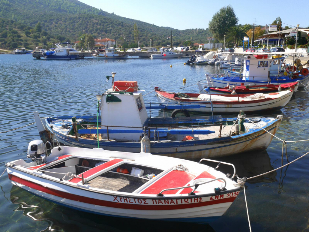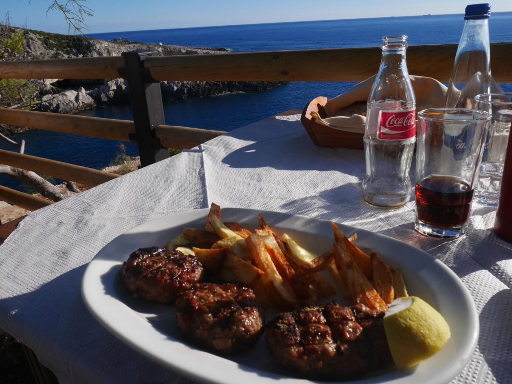 Nach dem Tauchen bleibt man in Kalamitsi oft noch zusammen sitzen oder geht auch mal direkt danach zusammen essen. Gerade so etwas mag ich besonders, denn genau diese Spontaneität geht einem in Deutschland doch oft ab. Mir geht es zu mindestens so. Vasilis entscheidet sich, nicht zurück in die Bucht von Kalamitsi zu fahren, sondern wir legen stattdessen im Hafen des Nachbarortes an. Dort wartet Sylvia schon auf uns und durch den Fahrtwind getrocknet, können wir auch direkt in eines der einladenden Restaurants direkt an der Marina überwechseln. Die schöne Terrasse liegt noch in der Nachmittagssonne und wir alle genießen das warme Licht. Natürlich erledigt Vasilis wieder die Bestellung für mich und uns, so dass der Tisch wieder aussieht wie ein Buffet für einen Reisebus. Spontan kommen zwei weitere Tauchgäste dazu und das fällt bei der Menge an leckerem Essen definitiv niemandem auf. Im Gegenteil sie bereichern unsere sehr nette Runde. Der Wirt lässt es sich nicht nehmen, nach dem Essen mit einem weiteren Tablett zu uns zu kommen, dieses Mal allerdings sind es Ouzo-Stamperl: Jamas! Oder „Prost“, je nachdem…
