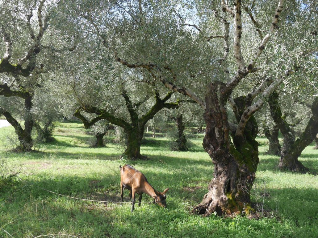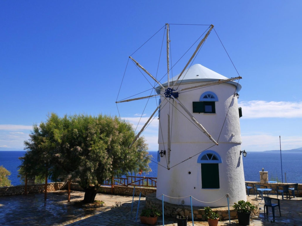 Auf dem Rückweg schlage ich den westküstennahen Weg ein, denn die Aussichten über das weite Land bis hin zum Meer sind phänomenal. Außerdem geht es auf dieser Route etwas dörflicher zu, so dass man noch mehr „vom Land sieht“. Ich sehe gemauerte Windmühlen, die genau so auf der Postkarte abgedruckt sein könnten, auf den Straßen blockieren mehrmals Ziegen die Durchfahrt und malerische Buchten gibt es so viele, dass ich mir weder die Anzahl noch die Namen merken kann. Als ich mich mal wieder eine mehr als kurvige Straße einen Berg hochgequält habe, passiere ich verknotete alte Bäume, die aussehen als ob sie einem „Herr der Ringe“-Film entsprungen sind. Olivenhaine wechseln sich mit fast aufdringlich, farblichen Mauergewächsen in den Ortschaften ab und immer wieder sieht man kleine Straßenstände, an denen diverse Kleinigkeiten verkauft werden. Die Landschaft ist so abwechslungsreich, dass ich mich schließlich bremsen muss, nicht an jeder Ecke Halt zu machen. Mein Ziel für ein sehr spätes Mittagessen bei warmem Sonnenlicht ist der Küstenbereich des Ortes Porto Limnionas. Nachdem ich die Hauptstraße verlasse, schlägt die Nebenstraße heftige Haken und es ist spürbar, dass hier in kurzer Zeit Tiefe erreicht werden muss. Es geht zügig einige Höhenmeter nach unten, entsprechend viel kurble ich am Lenkrad, aber die letzten Meter vor dem Restaurant zaubern mir dann ein lachendes Staunen ins Gesicht. Das Restaurant liegt nämlich ganz exklusiv direkt auf der Klippenkante mit einem Panorama, das so wundervoll ist, dass ich nur versuchen kann, es zu beschreiben. Seitlich fällt die Felswand terrassenförmig zu einer filmreifen Lagune ab, so dass es mehrere schöne Möglichkeiten gibt sich auf einem der vorhandenen Liegestühle in der Sonne zu baden. Das Wasser in der Bucht schillert in der Nachmittagssonne und die unterschiedliche Blautöne sind zu kitschig, um einen Vergleich anzustrengen. Ich wähle den Tisch in einer Ecke der Terrasse, der mir den Blick auf die Bucht und das weite Meer ermöglicht, wobei mir die Sonne fast direkt ins Gesicht scheint. Wenig später bekomme ich mein Bifteki zusammen mit einer kühlen Coke und ich schätze mich unendlich glücklich, gerade jetzt genau hier zu sein. Während ich da so sitze und mein Essen genieße, wird mir klar, dass es nur absolut logisch ist, dass bei dieser landschaftlichen Schönheit die Dichter und Denker der Antike aus Griechenland kommen mussten.