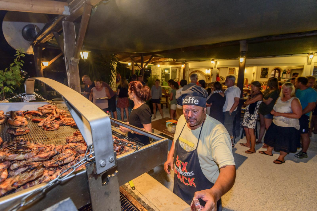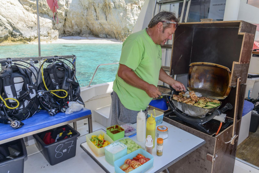 Meine Zeit auf Zakynthos nähert sich leider schon dem Ende, aber ich habe Glück, denn mindestens einmal pro Woche gibt es in der Tauchbasis Nero Sport einen Grillabend. Oder aber einen Fischabend. Oder einen griechischen Abend. Irgendwas besonderes auf jeden Fall und diese Abende sind wirklich absolute Highlights während eines Aufenthalts bei Nero Sport. Den ganzen Tag schon wuseln Peter und Lotte, sowie das gesamte Team, durch die Tauchbasis, um die entsprechenden Vorbereitungen zu treffen. Um bei so einem Abend dabei sein zu können, sollte man sich übrigens vorher unbedingt in eine der ausgehängten Listen eintragen, denn die Plätze sind alleine schon aufgrund der Kapazität an den Tischen begrenzt. Wer jetzt aber denkt, dass es sich um eine Handvoll Plätze handelt, der irrt, denn bei unserem Fischabend zum Beispiel versammeln sich ca. 30 hungrige und vorfreudige Taucher und Gäste, die allesamt, um die Kochkünste der Nero-Sport-Crew wissen. Bei Grillabenden unter freiem Himmeln sind es sicherlich sogar noch mehr Anmeldungen, denn neben der guten Küche ist die heimelige Atmosphäre an der Tauchbasis einfach Weltklasse. Für mich ist das ohnehin eine der größten Künste im Tauchbereich, diese Gratwanderung aus seriöser Tauchbasis, die alles ordentlich und zuverlässig abwickelt, und kumpeliger Wohlfühloase mit Flair, wo jeder gerne auch abseits des Tauchen abhängt, hinzubekommen. Sollte jemand den Wunsch verspüren genau dies einmal live zu erleben, sollte er zu Nero Sport reisen. Das Team ist fantastisch, kümmert sich um alles, Möglichkeiten werden erklärt und Hilfe wird angeboten. Dazu findet man eigentlich immer jemanden auf der Tauchbasis, mit dem man reden, erzählen oder was auch immer machen kann. Einfach nur super! Die Beiträge bei Taucher.net sprechen hier übrigens eine deutliche Sprache, aber dies nur am Rande. Als es endlich Abend ist und sich alle nach und nach an den Tischen versammeln, liegt schon ein leckerer Geruch in der Luft. Nach und nach werden die frischen Fische serviert und jeder einzelne Teller wird einem langgezogenen „Oooh“ oder „Aaaah“ kommentiert. Dummerweise sitze ich am letzten Tisch, was bedeutet, dass ich viele Ooohs und Aaaahs mit anhören darf, bis mein Fisch endlich den Weg zu mir gefunden hat. Zu dem gegrillten Leckerbissen gibt es eine griechische Spezialität, eine Art Kartoffelbrei mit Knoblauch, Zitrone und ganz viel leckerem Olivenöl, sowie frischen Salat. Ein Gedicht. Lotte hat sich in der Küche selbst übertroffen und mein letzter Abend könnte nicht besser sein. Bis Peter mit seiner, in Taucherkreisen bekannten, Ouzo-Flasche anrückt und großzügig 0,2 Gläser vollmacht. Eine Widerrede gibt es quasi nicht und so zische ich die gefühlte Ouzo-Maß weg. Ein paar lustige Tauchergeschichten und einige weitere „einer geht noch“-Ouzos später, bin ich, wie eingangs erwähnt, heilfroh, dass sich das Appartement direkt hinter der Tauchbasis befindet und ich einfach nur den Feldweg nach hinten torkeln muss. Mein Flug nach Athen geht um 06.40 Uhr. Na dann, gute Nacht…!