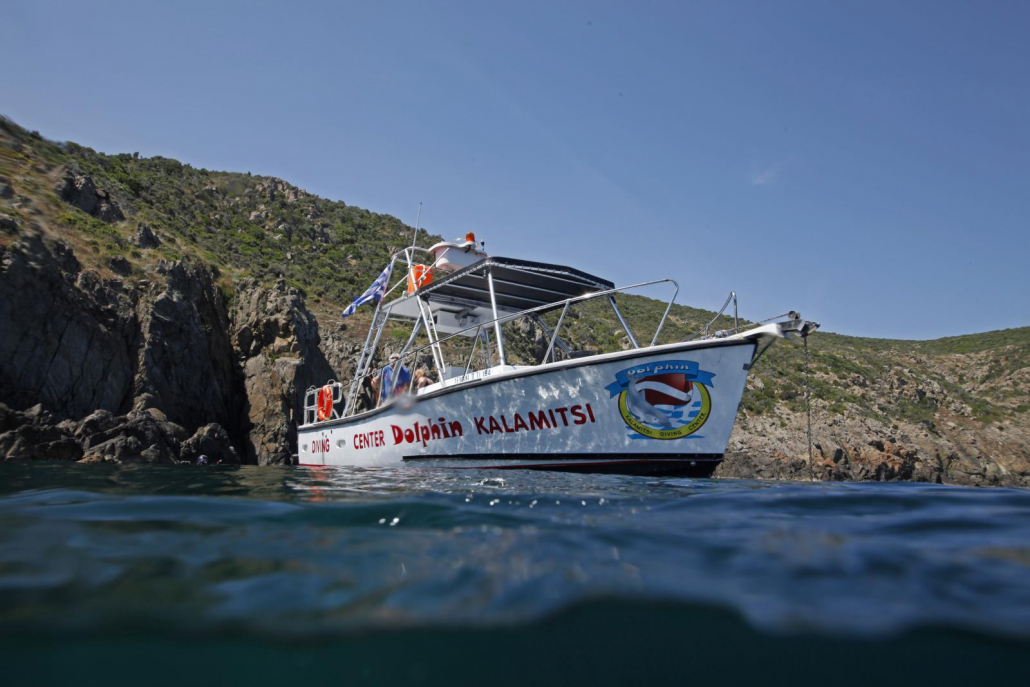 Abgeholt werde ich von Vasilis, dem Inhaber der Tauchbasis Dolphin Dive in Kalamitsi. Vasilis ist Deutsch-Grieche, die Familie kommt aus Griechenland, groß geworden ist er aber in NRW. Entsprechend spricht er fließend deutsch und hat einige deutsche Eigenschaften verinnerlicht, wie zum Beispiel Zuverlässigkeit, Seriosität und Pünktlichkeit. Er und seine Münchner Frau Sylvia leiten die Tauchbasis mit der dazugehörigen Café-Bar in Kalamitsi PLUS ihr eigenes Hotel, direkt hinter der Tauchbasis.