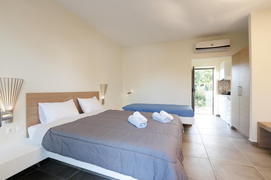 Die Tauchbasis Nero Sport liegt nur wenige Meter vom Strand von Keri entfernt, wobei man ehrlicherweise sagen muss, dass der Strand kein feiner Sandstrand ist. Damit wirbt auch keiner, denn es gibt genügend andere richtig schöne Strandbereiche in der Region. Direkt hinter der Tauchbasis liegt das Appartementhaus Gunelli und das ist selbstredend ungemein praktisch: Hotel und Tauchbasis quasi in einem. DENN, nach dem Tauchen wird in der Basis schon mal der eine oder andere Ouzo ausgeschenkt und dann ist es gar nicht so schlecht, wenn man im wahrsten Sinne des Wortes nur um die Ecke ins Bett fallen muss. Aber dazu später mehr. Die Appartements sind einfach, aber schön. Es gibt alles was man braucht und das zu einem fairen Preis: Die Möglichkeit zwischen einem oder zwei Schlafzimmern zu wählen, dazu eine gut ausgestattete Küche, sowie einen Tisch und einen Balkon bzw. eine Terrasse. Auf diesen gibt es Vorrichtungen, wo man seine nassen Sachen zum Trocknen hinhängen kann, insofern ist erst mal an alles gedacht. Hier haben Taucher über den Urlaub von Tauchern nachgedacht. Sollten die Appartements Gunelli ausgebucht sein – und das kommt in der Hochsaison garantiert vor – gibt es als gleichwertige Alternative noch die Appartements Delfini, welche quasi identisch ausgestattet sind, jedoch 5 Minuten zu Fuß entfernt liegen. Aber das ist kein Problem.