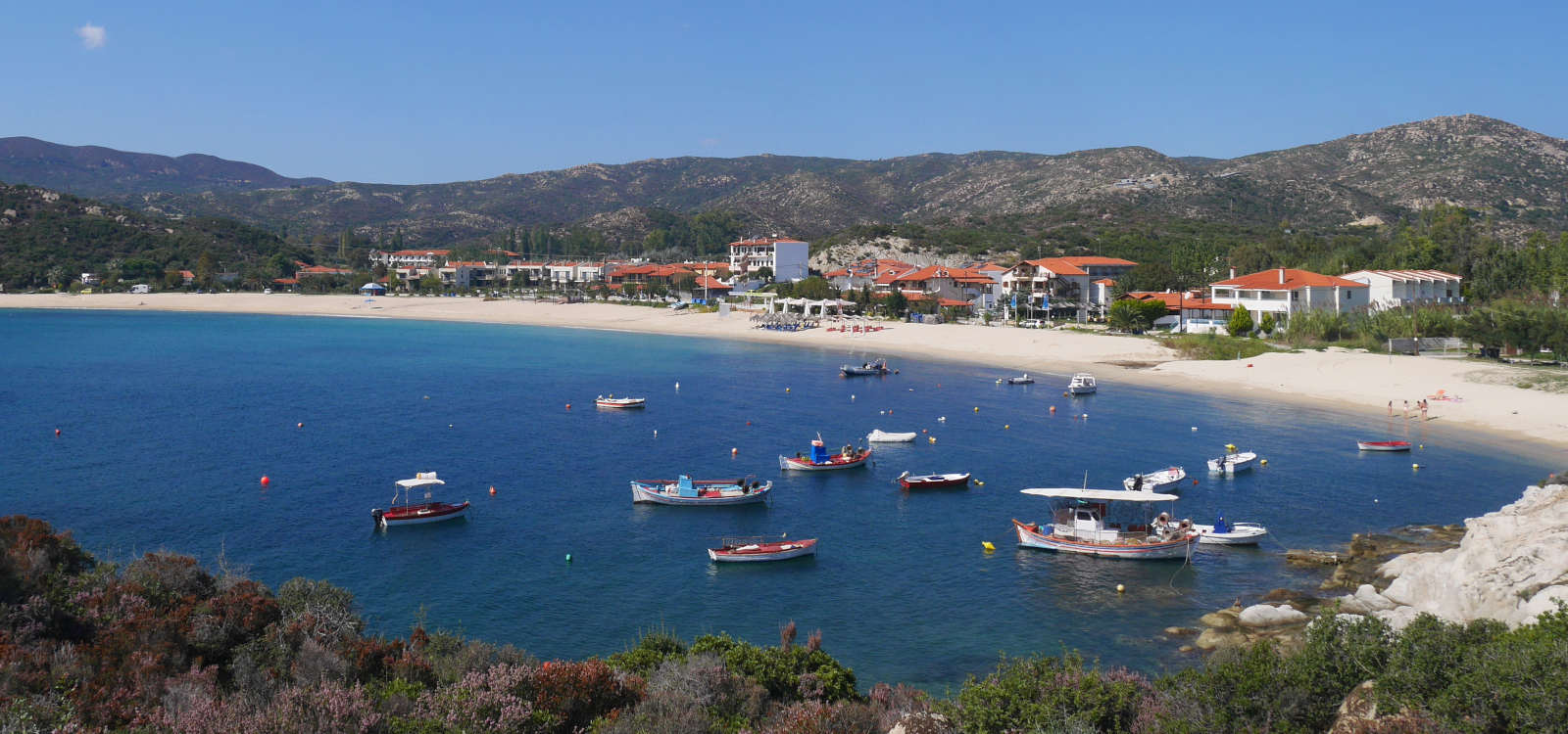 Am nächsten Morgen werde ich von Sonnenschein geweckt und als ich meine ersten Schritte auf die Straße heraus setze, traue ich meinen Augen nicht. Gestern nach dem Abendessen war es natürlich schon dunkel, ich war hundemüde und habe demnach nicht mehr viel von meiner Umgebung gesehen. Jetzt aber, bei Tages- und Sonnenlicht sehe ich einen der schönsten Strände, den ich am Mittelmeer je gesehen habe. Die Tauchbasis Dolphin Dive von Vasilis und Sylvia befindet sich zentral in der Bucht direkt am Strand. Und an diesem stehe ich jetzt und staune. Feiner, weißer Sandstrand, eine sichelmondförmige Bucht mit türkisblauem Wasser, eingerahmt links und rechts von dicht bewachsenen Felsen. Im Meer liegen wie gemalt einige kleine Fischerbötchen, die das traumhafte Bild dieses Strandes abrunden. Gut, ich muss dazu sagen, es ist Nebensaison und entsprechend ruhig ist der Strand gerade, aber dennoch einen solch schönen und noch dazu breiten Sandstrand muss man erst mal haben. Das Wasser läuft ganz flach hinein, wodurch man in der gesamten Bucht wunderbar baden und entspannen kann. Auch für Kinder ist das hier ein sehr großzügiger Spielplatz. Aber was erzähle ich hier lange, schauen Sie sich einfach meine Bilder an und Sie werden meine Begeisterung sofort verstehen und ganz sicher teilen. Wow!