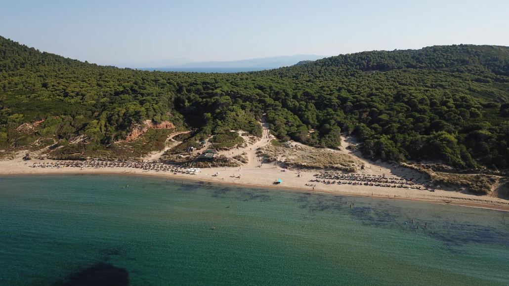 Das besondere an diesem Strand ist die pittoreske Szenerie. Der breite helle Sandstrand wird von einem tiefgrünen Pinien- und Kiefernwald umrandet und bildet einen atemberaubenden Kontrast zu dem tiefblauem Wasser.