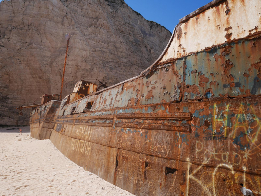 Wahlweise heißt die Bucht übrigens auch Shipwreck Bay oder Schmugglerbucht. Die verschiedenen Namen der Bucht und die Geschichte des alten Schiffes liegen hier ganz dicht beieinander. Iim Jahr 1980 wollte nämlich der Frachter Panagiotis, vollbeladen mit geschmuggelten Zigaretten, eigentlich an der Küste anlegen. Er wurde allerdings von der Küstenwache bemerkt und es kam zu einer rasanten Verfolgungsjagd, bei der das Schiff vor der Bucht Agios Georgios – so der damalige Name aufgrund des dort befindlichen, gleichnamigen Klosters – auf Grund lief und an Land gezogen wurde.