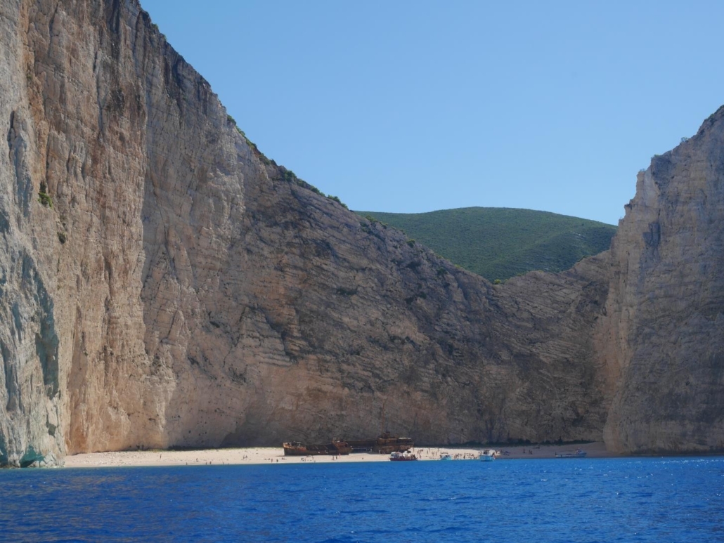 Ich fand die Tour zur Navagio Bucht absolut fantastisch! Steuert man mit seinem Boot auf die Schmugglerbucht zu, verstecken die Klippen zunächst den Strand. Kommt man schließlich näher, sieht man als erstes das riesige Wrack der Panagiotis, das wunderschön auf dem langen Strand aufgerichtet steht und das fantastische Panoramabild wunderbar ergänzt. Das Wrack der Panagiotis liegt mittig in einem kupfer-rostigen Farbton am Strand, was irgendwie bizarr aussieht, aber zugleich auch einen besonderen Kontrast darstellt.