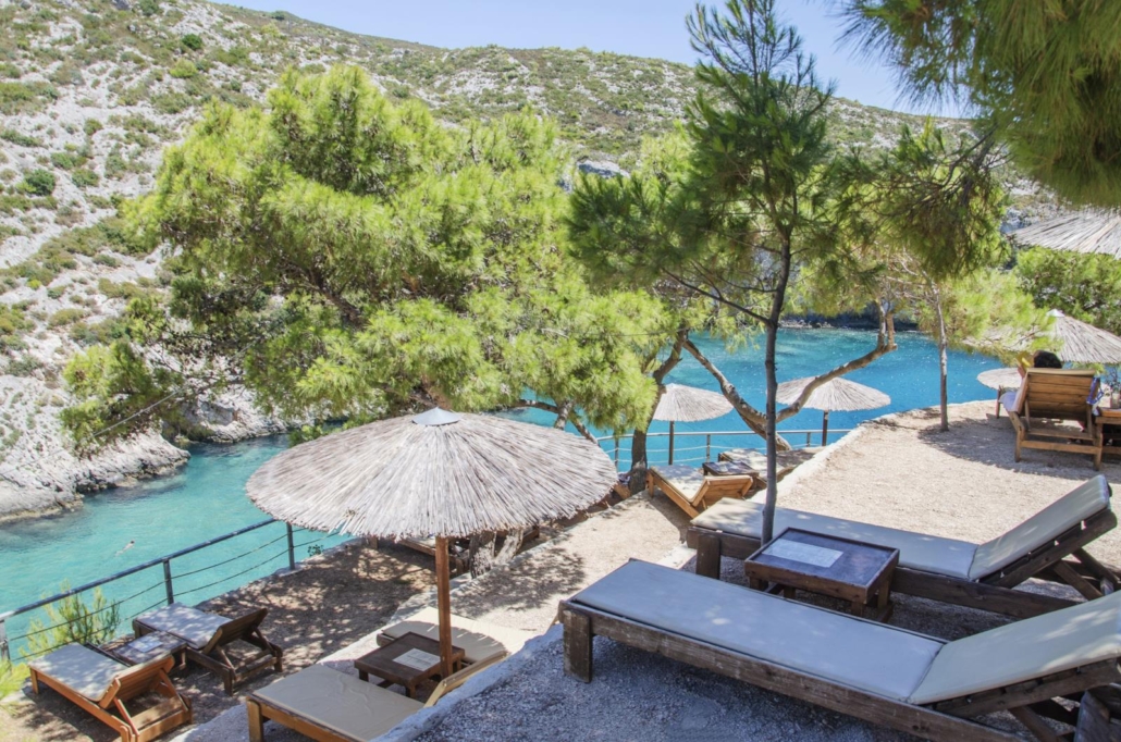 • Es gibt in der Bucht KEINEN Strand. Es handelt sich um eine wunderschöne Bucht, allerdings kann man sich nur auf den Felsen oder auf einer der angelegten Betonterrassen niederlassen. In der Taverne besteht aber immerhin die Möglichkeit Liegestühle zu buchen. Der Preis ist immer der gleiche, egal ob man einen ganzen Tag oder nur eine Stunde dort bleibt.