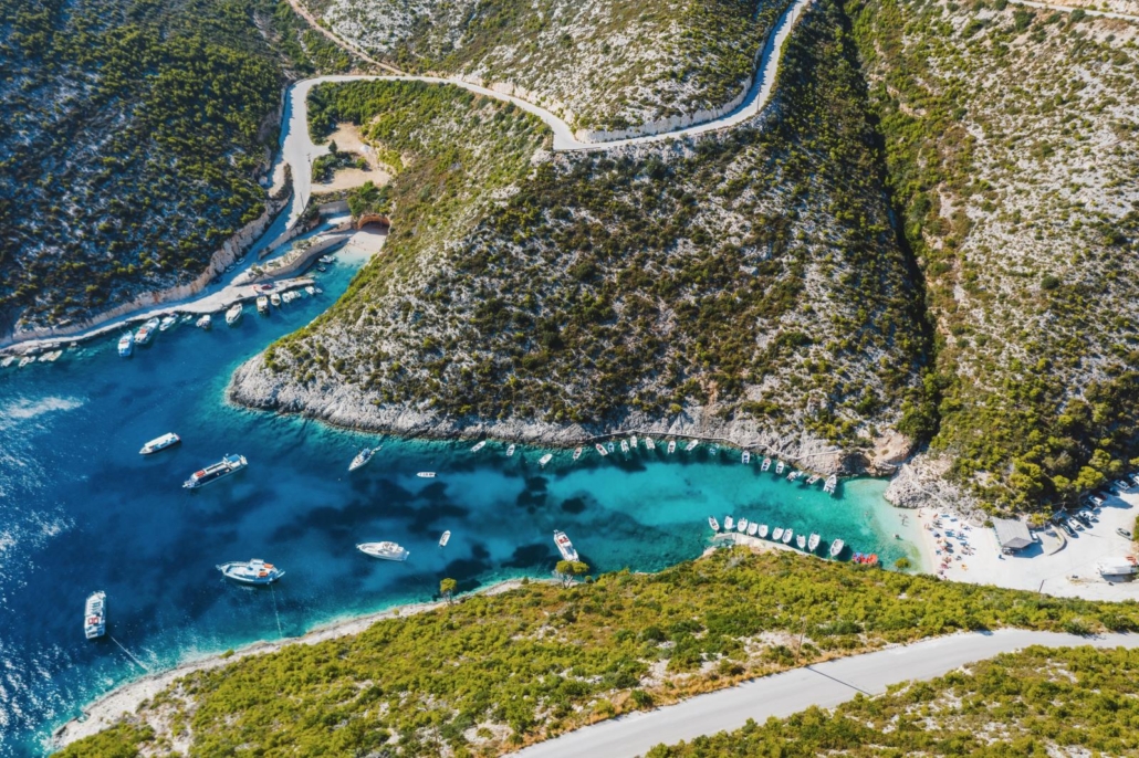 Ebenfalls an der Westküste – zwischen Porto Limnionas (siehe unten) und der Navagio Bucht – befindet sich diese doch sehr besondere Bucht, die sich aus Fotografensicht vor keiner anderen Bucht auf Zakynthos verstecken muss. Das Wasser schlängelt sich behutsam ins Landesinnere und endet in zwei kleineren Stränden, die auf getrennten Straßen erreicht werden.