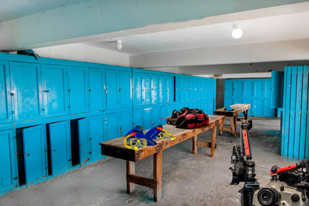 Das Hausriff ist in meinen Augen übrigens einer der besten Tauchplätze der Insel! Das gilt es jetzt mal wieder zu bestätigen. Die Tauchbasis des Captain Don’s Habitat befindet sich praktischerweise direkt neben dem Restaurant. Dazwischen dient als Trennung lediglich eine Deko-Bar, die vor allem abends zum Sundowner immer sehr gut besucht ist. Für die Taucher stehen eigene Schließfächer (es lohnt sich ein kleines Schloss von zu Hause mitzubringen – idealerweise ein Zahlenschloss, denn dann braucht man keinen Schlüssel im Tauchanzug zu verstecken), Waschbecken, Trinkwasser und genügend Ablageflächen zur Verfügung, so dass sich jeder in aller Ruhe vorbereiten kann. Dazu wurden zwei Docks gebaut: Mama- und Papadock. Papadock dient als Anlegesteg für die Boote und Mamadock ist Start und Ziel für die Hausrifftaucher. So kommt sich niemand in die Quere, was ich irre praktisch und gut durchdacht finde.