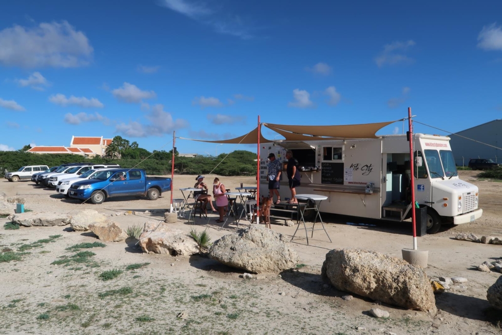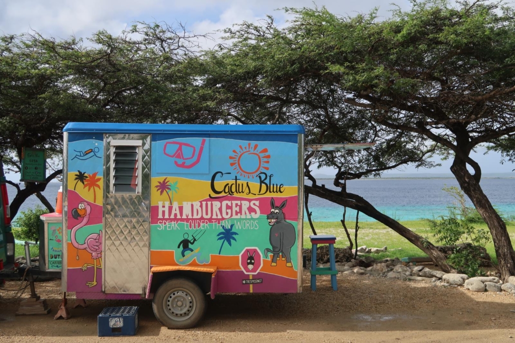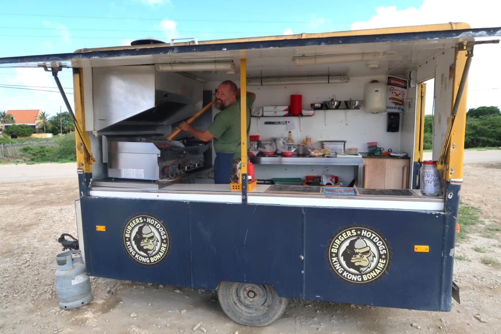 Ein weiterer Vorteil, der den Geldbeutel schont, ist die Tatsache, dass man sich auf Bonaire auch sehr gut selbst versorgen kann. Sofern man das möchte. Supermärkte gibt es genug, so dass man jederzeit sein Frühstück einkaufen und im Kühlschrank verstauen kann. Einige Hotels und Zimmerkategorien haben sogar eigene Küchen, wodurch man sich auch komplett unabhängig machen kann. ABER ich muss dazu sagen: Es gibt tolle Restaurants auf Bonaire! Und es gibt überragende Foodtrucks (Essenswagen), sowie kleine, einheimische Buden. Mein absoluter Favorit ist der Foodtruck KingKong nahe des Flughafens. Der Betreiber ist ein ehemaliger Tauchlehrer und hat sich offensichtlich seiner großen Liebe hingegeben: Hamburger. Beim Schreiben dieser Zeilen läuft mir das Wasser im Mund zusammen, weil was dort in diesem kleinen Wagen auf den Grill gezaubert wird ist ein Genuss. Der Inhaber sieht aus wie ein Pirat in Rente, hat aber großen Spaß daran mir zu erklären, dass er alle seine Zutaten handverlesen selbst besorgt bzw. einkauft. Seine Pfeffermühle ist ein umfunktionierter Baseballschläger und auf meinen Wunsch hin, lässt er ordentlich Pfeffer auf mein Fleisch regnen. Vielleicht motiviert ihn auch nur mein euphorisch bis hungriger Gesichtsausdruck, in jedem Fall ist der Burger ein Knaller. Nach dem ersten Bissen bestelle ich nickend und mit großen Augen direkt einen zweiten Hamburger, was der Inhaber lachend quittiert. Kurz danach brutzelt es bereits wieder auf seinem Grill. Auch das ist Bonaire, für Taucher kann es doch auch mal unkompliziert sein und so ein sensationelles Essen zwischendurch ist ja quasi der Idealfall. Sobald man das Essen mit einer Coke heruntergespült und noch ein bisschen mit Blick auf das Meer entspannt hat, kann es theoretisch sofort wieder ins Wasser gehen. Easy. Angenehm.