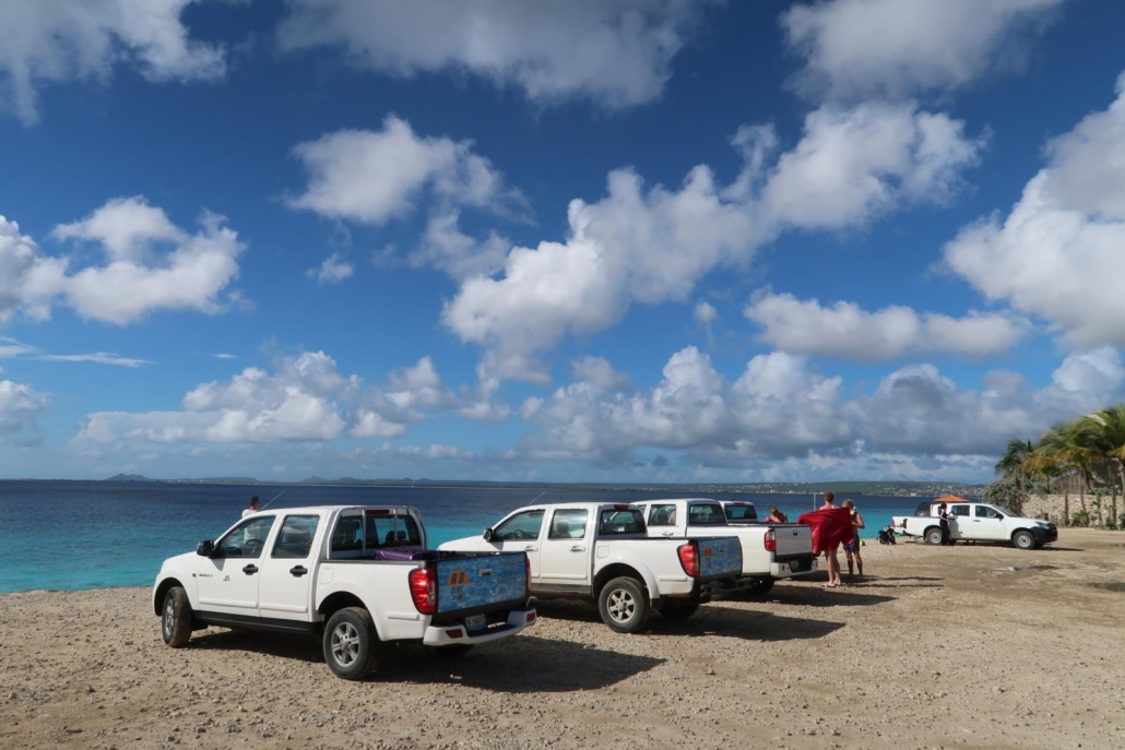 Für diese Art des Tauchens benötigt man lediglich einen passenden Mietwagen, mit dem man jederzeit samt seinem Tauchequipment um die Insel fahren kann. Und da die meisten Urlauber auf Bonaire Taucher sind, ist der Mietwagenverleih auf Bonaire ganz auf diese Gäste ausgerichtet. Entsprechend mieten sich die meisten Gäste einen Pick-Up-Truck mit großer Ladefläche, auf dem man all sein Gerödel plus so viele Tauchtanks wie man mitnehmen möchte, packen kann. Die Tauchplätze sind praktischerweise an der Straße mit gelben Steinen und dem Tauchplatznamen markiert, so dass man immer sofort weiß wo man ist.