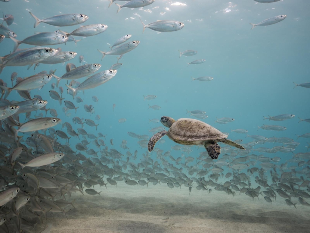 Die Sicht ist fantastisch und wir lassen uns zum vom Ufer aus rechten Teil der Anlage treiben. Klar, gegen die Brandung muss man auch ein bisschen strampeln, aber das merkt man in der Vorfreude kaum. Das Blau ist auch hier wirklich unheimlich blau. Ich meine, es ist dieses tiefe Blau, dass man immer auf den gefotoshoppten Bildern zu sehen bekommt. Um ehrlich zu sein, am liebsten würde ich den Regler aus dem Mund nehmen und mal schnell einen Schluck davon trinken. Wir kommen vorwärts und dann kann ich langsam etwas vor uns erkennen. Die Umrisse der ersten Plattform zeichnen sich ab. Jetzt macht es sich bezahlt, dass wir niemanden vor uns hatten, denn das Erlebnis ist definitiv gewaltiger, wenn die einzelnen Blöcke aus massiven Säulen jeweils für sich ohne störende Luftblasen erscheinen. Langsam schälen sich die dicken Stützen aus ihrer blauen Umgebung. Je näher man kommt, desto kleiner fühlt man sich. Vorsichtig schwimme ich in die Mitte dieses Stahlwaldes und treffe auf einen imposanten Fischschwarm. Die Grunzer bewegen sich kaum, sondern inspizieren mich stoisch. Schließlich ist das hier ihr Zuhause und ich bin nur zu Besuch. Meine GoPro ist begeistert – viele Farben mit schickem Kontrast. Als ich dem Rest der Gruppe Platz mache, erkenne ich, dass das nächste Highlight schon auf mich wartet, und zwar ein Strudel von Pferdemakrelen (Horse-Eye-Jacks). Ich finde es großartig, wenn sich ein Schwarm immer selbst im Kreis überholt und könnte dieser Masse an Fischen Stunden dabei zuschauen. Dummerweise mögen sie kein Publikum und lösen ihren Hypnosekreis auf. Weiter geht es zur nächsten Plattform samt den dazugehörigen Säulen und dort sind gefühlt nochmal doppelt so viele Fische. Unfassbar. Eine echte Fischsuppe. Ein dicker Barrakuda pflügt durch die Massen und es tut sich eine ehrfurchtsvolle Gasse auf. Ein sensationeller Anblick. Bei der nächsten Station sind es ein bisschen weniger Fische, und ich kann die Szenerie noch ein bisschen mehr aufsaugen. Fantastisch. Wenn Stahl auf Wasser trifft, hat das schon oft etwas Faszinierendes. Nachdem wir alle Bereiche abgetaucht haben und zurück zum Ufer treiben, kreuzen noch zwei Schildkröten unseren Weg. Eine wunderschöne Verabschiedung…