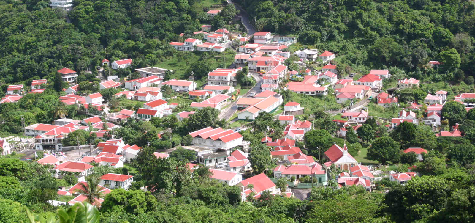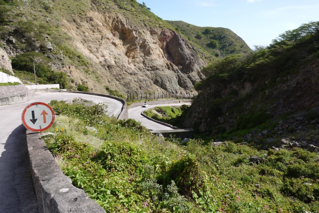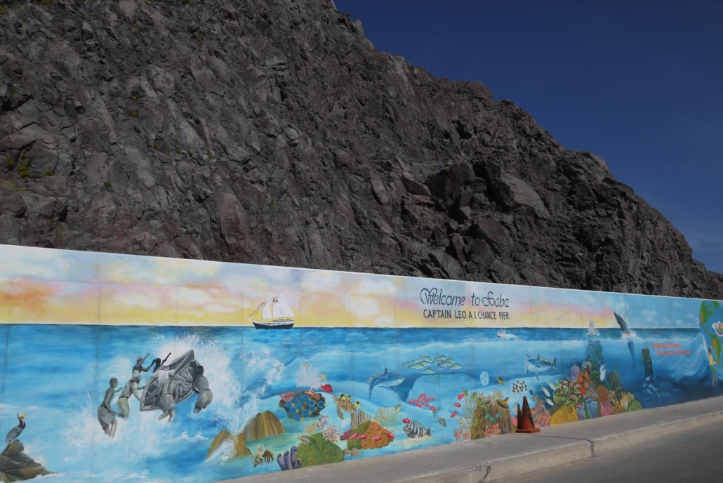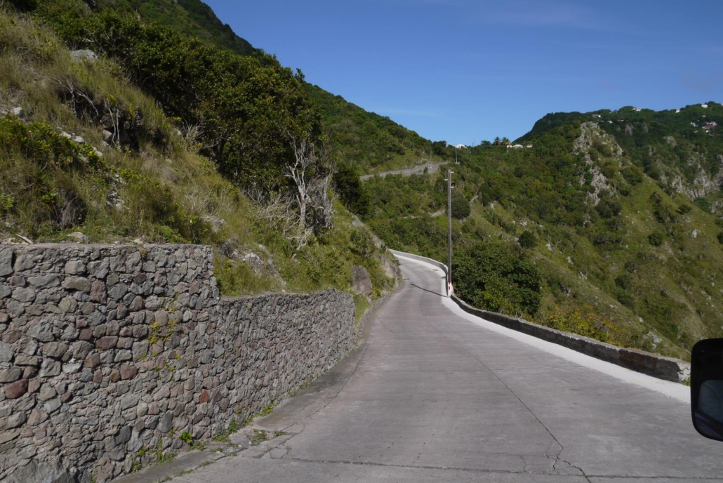 Am nächsten Morgen geht es das erste Mal zum Tauchen und ich bin schon sehr gespannt, ob ich meinen Hai von damals wiedersehen werde?! Die Fahrt vom Scouts Place zum Hafen hinunter gleicht einer Sightseeing Tour durch Saba, beginnend mit der Straße selbst. Das klingt banal und wie ein Witz, ist aber auf Saba tatsächlich so etwas wie eine Hauptattraktion, denn die Geschichte des Straßenbaus ist erstaunlich. Die holländische Regierung hielt 1938 den Bau einer solchen Straße in die Berge hinein für unmöglich, weshalb Einheimische unter der Leitung eines gewissen Herrn Hassell, den Bau der Straße auf eigene Faust und anfangs sogar ohne technische Hilfsmittel vorantrieben. Kurioserweise eignete sich Herr Hassell seine Straßenbaukenntnisse selbst per Fernstudium an! 1958 wurde die Straße fertig gestellt und von den kreativen Einheimischen liebevoll „The Road“ getauft. Wenn man hier nach der Geschichte dieser Straße fragt, bekommt man stolze Geschichten erzählt, auch wenn es sich eben nur um die Straße handelt. Sobald man die ersten Serpentinen hinter sich gelassen hat, öffnet sich ein weiter Blick, die Berge hinab, bis aufs Meer. Dieses schon mehrfach erwähnte satte Grün ist unfassbar, vor allem im Kontrast zum dunkelblauen Wasser. Das Meer sieht fast aus, als ob eine Plane auf ihm liegt – einmalig. Wenn sich die Straße dann weiter durch die Insel arbeitet, erreicht man The Bottom und kann so etwas wie das Maskottchen der Insel gut erkennen. Es ist der Gebirgszug über The Bottom, der wie ein Walfisch aussieht und schützend über dem kleinen Ort schwimmt.  Windwardside und The Bottom haben jeweils nur ca. 450 Einwohner und nahezu jedes Haus ist weiß gestrichen, hat grüne Fensterläden und ein rotes Dach. Auch das ist ein klasse Anblick – die griechischen Inseln haben blaue Dächer, Saba hat eben rote… Schließlich erreichen wir den Hafen und es ist ein Mittwoch – der Tag, an dem die Fähre von St. Maarten ankommt, um Nahrungsmittel und Transportgüter jeder Art nach Saba zu bringen. Von Bier bis hin zu Autos ist da alles dabei, entsprechend ist das Treiben am Hafen groß und lustig zu beobachten, wo der Hafen doch normalerweise sehr ruhig ist.