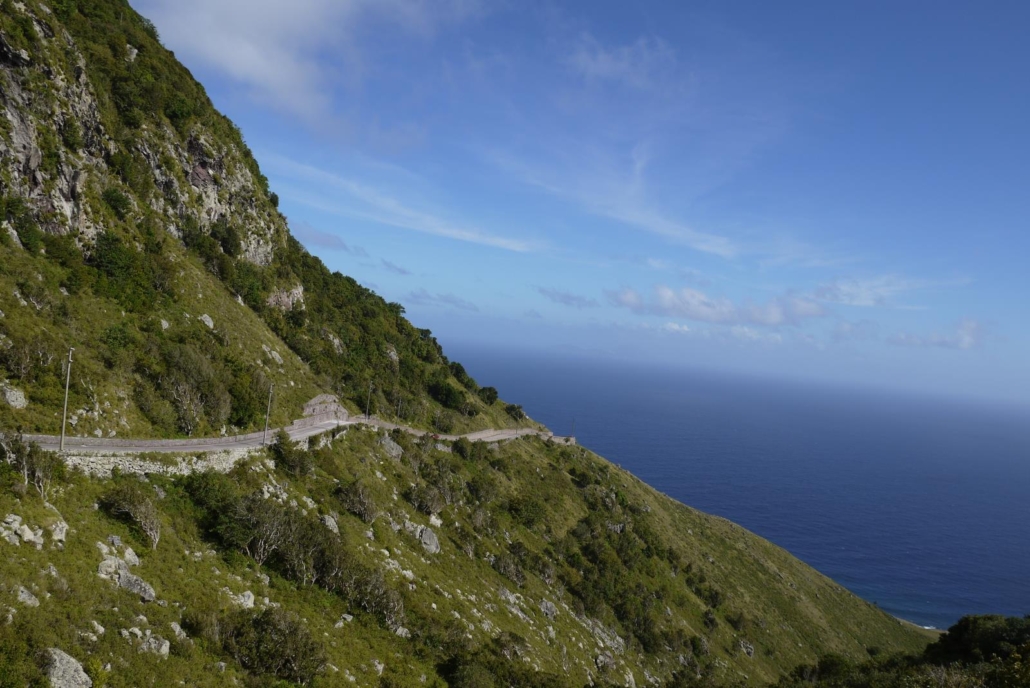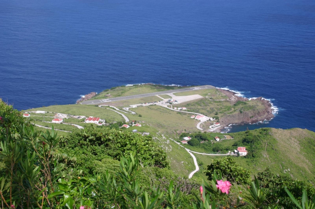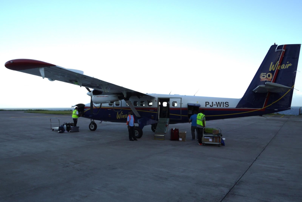 Der Flug von St. Maarten nach Saba ist dann das, was für einige Gäste großartig bis Weltklasse ist, während es Menschen ohne Flugaffinität als „unnötiges Abenteuer“ empfinden. Denn Saba ist nicht das, was man sich landläufig unter einer karibischen Insel vorstellt. Strände und Palmen sucht man hier vergebens. Es handelt sich nämlich um eine vulkanische Insel mit schroffen Klippen und grünen Berghängen, wie in den schottischen Highlands. Traumhaft anzusehen und ich bin mir sicher die wenigsten kennen solche Ausblicke (mich eingeschlossen). Die Beschaffenheit Sabas ist wirklich außergewöhnlich. Als ich 2002 das erste Mal hierher reiste und mein Flieger sich den Felswänden von Saba näherte, dachte ich, dass hier wohl der Film Jurassic Park gedreht wurde. Von Häusern oder Straßen ist keine Spur zu erkennen – wie in den Highlands eben… Und in den Highlands gibt es auch kaum Flughafenlandebahnen, was auf Saba aber elegant gelöst wurde – mit der kürzesten kommerziellen Landebahn der Welt, umgeben von Wasser und einer kleiner Landzunge. Piloten werden extra ausgebildet für diesen Flughafen, was mir sinnvoll erscheint. Es ist lustig jedes Mal die gespannten Köpfe zu beobachten, wie sie versuchen einen Blick auf den Anflug zu erhaschen. Wenn man auf der richtigen Seite des Flugzeuges sitzt (in Flugrichtung rechts) kann man sehr schön die Umrisse von Saba erkennen, die Insel als Ganzes betrachten und die tollen Hänge, sowie den tropischen Bewuchs sehen. Wie sich die ersten roten Dächer der weißen Häuser in das dunkle grün mischen. Wie das Flugzeug über eine Art Klippenvorsprung hechtet, um direkt danach auf die Landebahn hinunter zu segeln. Traumhaft, die Kameras klicken und die Videos werden wenig später ganz sicher bei Facebook gepostet. Ich saß dieses Mal auf der linken Seite und habe nichts als Blau und einem flackernden Propeller gesehen.