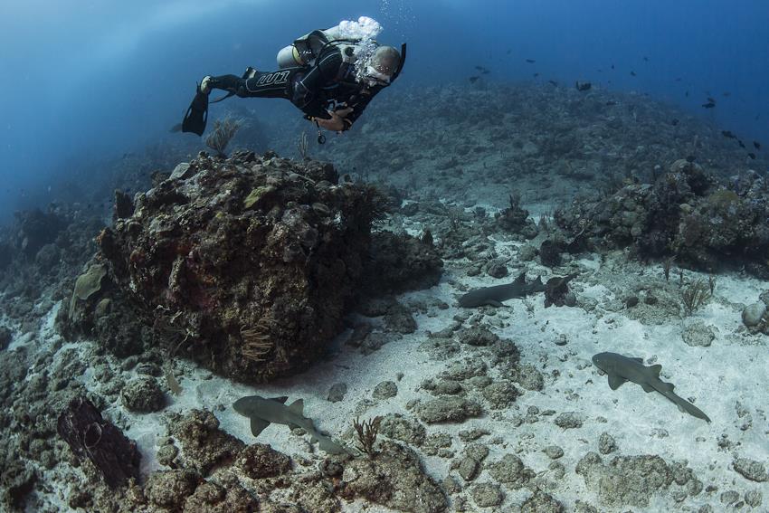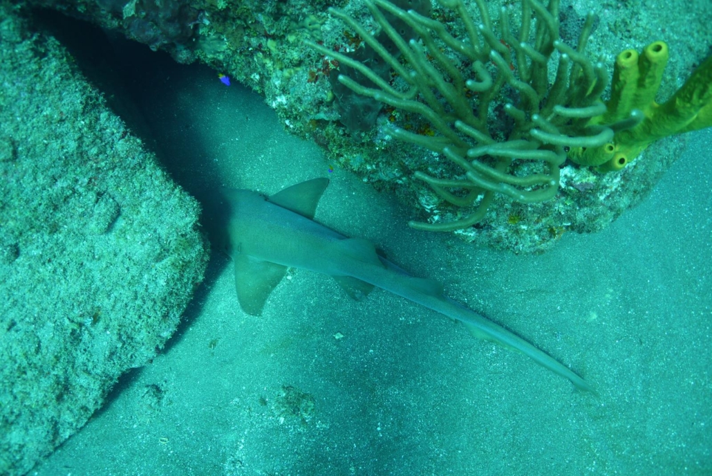 Rein ins Wasser und los geht’s… Die Sicht ist gut und man erkennt sofort, dass es sich um eine vulkanische Insel handelt, der Boden ist dunkel, der Bewuchs aber auffallend üppig. Gehaltvoller Untergrund sagt man, glaube ich. Ich habe meine Kamera noch gar nicht richtig in der Hand, da streift uns schon fast der erste Schwarm Tarpune. Bei Tarpunen denkt man ja irgendwie immer zuerst, es seien Haie, denn die Bewegungen sehen ähnlich aus, dazu die Größe von ca. 1-2 Metern, allerdings schwimmt der Tarpun sehr langsam. Trotzdem, wegen der Größe allemal ein spektakulärer Einstieg und ich freue mich über die ersten guten Bilder. Wobei ich, wie gesagt, Anfänger bin, ich hatte gerade erst eine Woche vorher die ersten Fotos geschossen. Und einen Blitz habe ich auch nicht, was ich als sehr passende Ausrede empfinde, denn meine Bilder sind eher kontrastarm… Sie werden später Bilder von mir und von einem echten Fotografen sehen, dann wissen Sie was ich meine. Das Dumme als UW-Fotografen-Neuling ist, dass man immer mit schlechtem Gewissen taucht, denn der Tauchguide muss eigentlich mit dem Zeigen von Besonderheiten immer auf einen warten, da man ja noch am letzten Motiv hängt und verzweifelt versucht, dem Lobster noch ein Lächeln abzuringen. Früher habe ich mich immer gewundert, was die Fotografen unter Wasser so lange treiben, jetzt ist das für mich als „alter Hase“ der Fotografen-Riege ganz normal. Das Tauchen auf Saba ist großartig, abwechslungsreich, irgendwie jagt ein Highlight das nächste. Als ich versuche einen Schwamm samt Barrakuda richtig in Szene zu setzen, umringt mich aus dem Nichts ein Schwarm Fische, als ob ich das Auge eines Hurricanes wäre. Minutenlang! Also gefühlt. Ich mache viele weitere tolle Bilder und freue mich, bei diesem Tauchgang dabei sein zu dürfen. Weiter geht es, diverse Lobster strecken uns ihre Antennen entgegen und die Kamera klickt. Hier Seepferdchen, dort Flamingozungen auf einer Gorgonie und Sandaale, die aus dem Boden kucken. Das ist Tauchen! Man muss erwähnen, dass auf Saba ein Nationalpark eingerichtet wurde, für den man auch bei jedem Tauchgang USD 3,– bezahlt – doch das Ergebnis ist spür- und sichtbar. Die Fische beispielsweise sind richtig zutraulich, das kennt man sonst gar nicht. Neugierig sind die Viecher teilweise, dass man denkt sie wollen einem was erzählen. Eine Schildkröte kommt auf uns zu und fängt inmitten unserer Gruppe an, das Riff anzuknabbern. Einfach nur klasse… Schließlich schwimmt sie weiter, und zwar direkt auf mich zu. Die Kamera klickt wieder und wie! Die Schildkröte stört das überhaupt nicht, im Gegenteil, sie posiert nochmal lässig und lenkt kurz vor mir ein, so dass wir um ein Haar fast kollidieren. Mein Foto dazu ist nicht gezoomt, nicht bearbeitet, gar nichts, genauso konnte ich das Bild machen, weil die Schildkröte nicht fluchtartig weg- sondern zu uns geschwommen ist. Fantastisch. Das große Finale ist dann natürlich „meinem Hai“ vorbehalten. Ein Ammenhai pirscht sich durch die Rifflandschaft und auch er lässt sich leicht verfolgen. Schließlich findet er, was er gesucht hat, nämlich seinen Spielkameraden. Also legt sich der Ammenhai locker ab und die beiden scheinen anzufangen zu plaudern. Meine Kamera klickt erneut und ich bin überrascht wie schnell eine Stunde vorüber sein kann. Auftauchen…