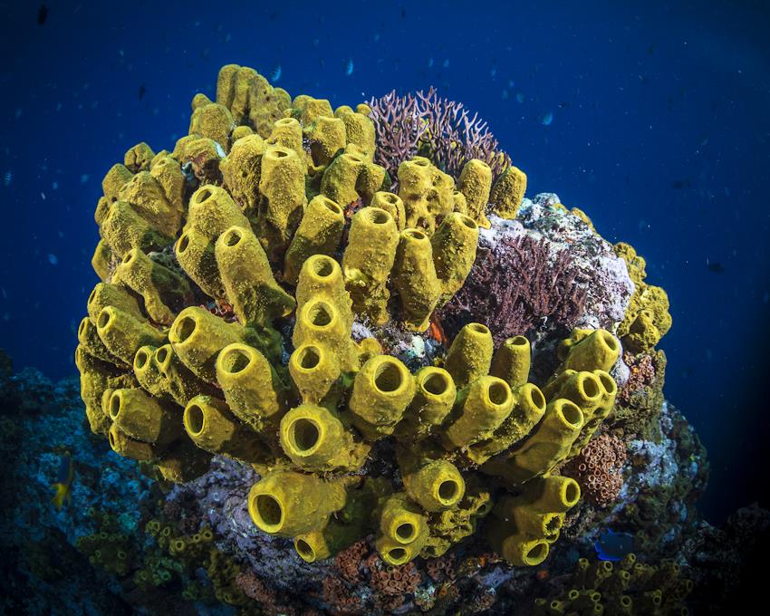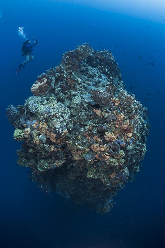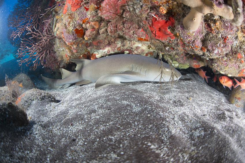 Zurück zum Tauchen, das Highlight steht an! Bei meinen früheren Aufenthalten habe ich es aus unterschiedlichen Gründen nie zu den Pinnacles geschafft, was mich immer geärgert hat. Die Pinnacles, zur Erklärung, sind Felsnadeln, die aus den Tiefen des Meeres fast bis an die Wasseroberfläche reichen und dadurch ein außergewöhnliches Szenario bieten, denn drumherum sieht man logischerweise nur Blau. Als wir den Tauchplatz erreichen, ist der Wellengang sehr stark, was das Adrenalin nur ein bisschen mehr pumpen lässt. Alicia erzählt wie immer fröhlich von ihren Erfahrungen und dass sie hier bisher immer Haie gesehen hat. Also gut, das nehme ich gerne! Ab ins Wasser und zackig abtauchen, denn die Nadelspitze liegt bei ca. 30 Meter. Anfangs ist alles marineblau und erst nach und nach kann man das schmale Riffplateau erkennen. Wir sind noch nicht ganz unten, da sehen wir auch schon einen Riffhai kreisen. Zackig, als ob es ein Wettlauf wäre, umrundet er unseren Tauchplatz. Als wir unten ankommen, biegt er aber in die Zielgerade ein und verschwindet im Blau. Schade, aber was für ein starker Beginn… Ca. 15 Meter, würde ich schätzen, ist die Oberfläche breit und besticht durch viele Höhen und Tiefen, denn so bieten sich viele Versteckplätze für die Riffbewohner. Und tatsächlich, eine viertel Runde später, begegnet uns wieder ein Ammenhai, allerdings befindet er sich vermutlich in der zweiten Traumphase, so entspannt wie er da rumliegt. Meine Kamera hat ihn gut und formatfüllend erfasst, so dass es schnell weitergehen kann. Der Bewuchs ist große Klasse, vor allem durch die Steilwand ergeben sich viele spannende Fotomotive, die ich aber dieses Mal ignoriere, denn die Zeit drängt ein wenig. Unser Tauchguide hat sich nämlich schon wieder bemerkbar gemacht und das zu Recht – drei richtig große Schildkröten „grasen“ fotogen am Riff. Man kann das knacken des Riffs förmlich hören, so intensiv knabbern sie daran. Unglaublich, was das für Brummer sind! Dummerweise blockiert meine Kamera den Auslöser und stellt nicht scharf. Ich habe keine Ahnung wieso, bin dadurch aber natürlich maximal bockig. Was für ein Ärger, drei so massige Schildkröten, unbeeindruckt von uns als Zuschauern, fast schon lächerlich ideal am bunten Riff platziert!?!?! Als ob sie mich erlösen wollen, „erbarmen“ sie sich und ziehen weiter. Na gut, dann beobachte ich sie eben wieder „nur“, wie ich das bisher auch gemacht habe. Auch nicht schlecht… Als wir die Umrundung abschließen, schaue ich nochmal nach dem Ammenhai, der immer noch vom Haiparadies träumt, denn er wirkt nach wie vor sehr gelassen. Auftauchen und ab ins schauklige Boot. Alicia fasst sofort zusammen, was wir alle gesehen haben, wofür ich sehr dankbar bin. Super Tauchgang, großer Tauchsport!