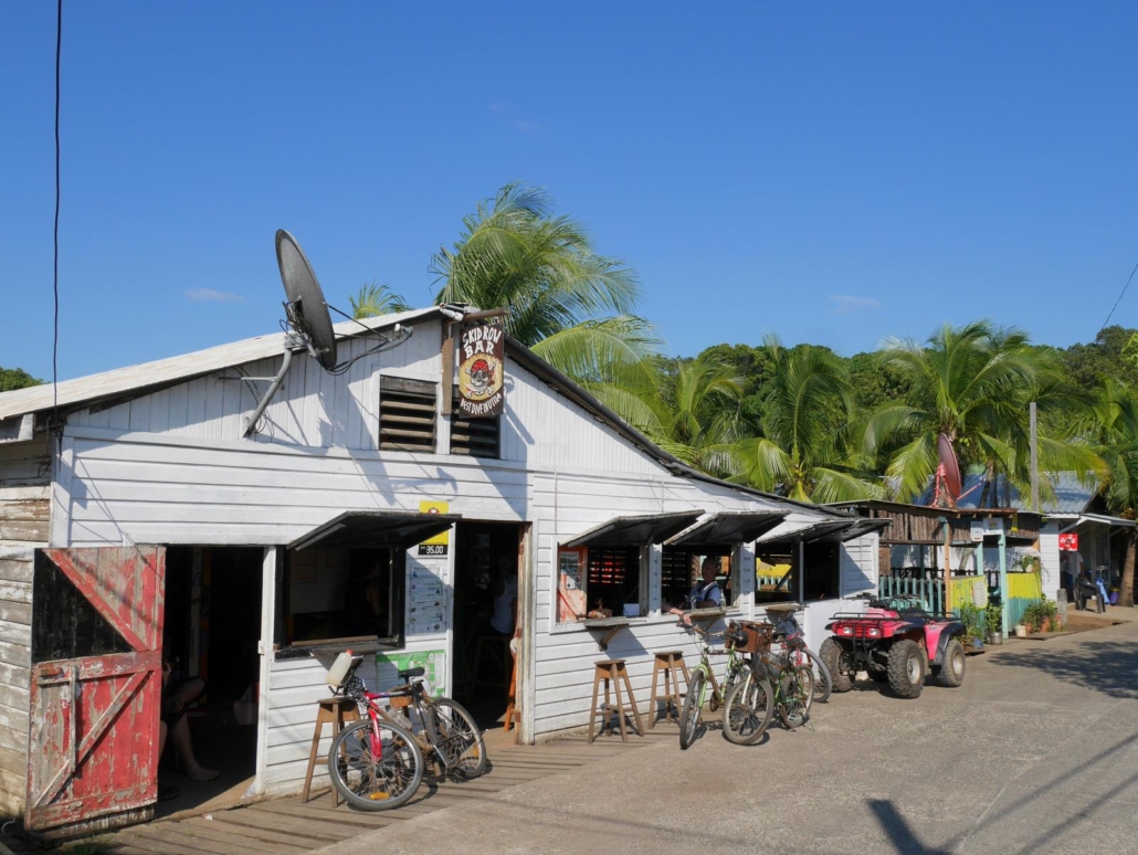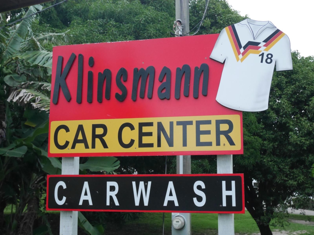 Für den Nachmittag hat sich Mike etwas ganz besonderes ausgedacht und wir unternehmen eine Mangroventour ganz in den Osten der Insel. Dazu gehört auch ein Mittagessen in dem, wie soll ich es sagen, etwas abgerockt wirkenden Restaurant „Hole in the Wall“. Es handelt sich um ein Bretterhaus, das auf einem Steg über dem Wasser errichtet wurde und dessen Style aussagt: hier hat es schon einige, richtig starke Partys gegeben. Das Mittagessen soll aber besonders gut sein und ich muss festhalten, dass das eine Lüge ist. Es ist fantastisch! Ich liebe diese etwas abgeschrabbelten Läden, von denen man nichts vermutet, in denen mir aber dann die Mutti des Hauses, zu meiner leichten Überraschung, ein vorzügliches Lobster-Sandwich serviert. Es ist so lecker, ich könnte davon gleich fünf Stück auf einmal essen. Dazu ein gekühltes Getränk und der Blick auf das Wasser – besser könnte es nicht sein. Nach dem einmaligen Essen, platzieren wir uns vollgefuttert alle wieder in unseren Kanus und treiben anschließend in Richtung Mangroven. Wir paddeln durch einen mystisch wirkenden, doch recht schmalen Kanal, der gerade mal so Platz für zwei Kanus nebeneinander bietet. Dies hat den Vorteil, dass man ganz dicht dran ist und das Wuseln der Krabben in den dichten Astverwirrungen beobachten kann. Hin und wieder tun sich kleine Binnenseen auf und die Kulisse wird dadurch noch beeindruckender. Das Wasser ist phasenweise glasklar und man kann das tiefe Wurzelwerk der Mangroven gut erkennen. Auf dem Rückweg halten wir noch am „Klinsmann Car Wash Center“ an, welches ich auf der Hinfahrt beim Vorbeifahren gesehen hatte. Ich muss unbedingt ein Foto von dieser grandiosen Waschanlage machen. Was ist das denn für eine sensationelle Idee, seine Waschstraße so zu nennen?