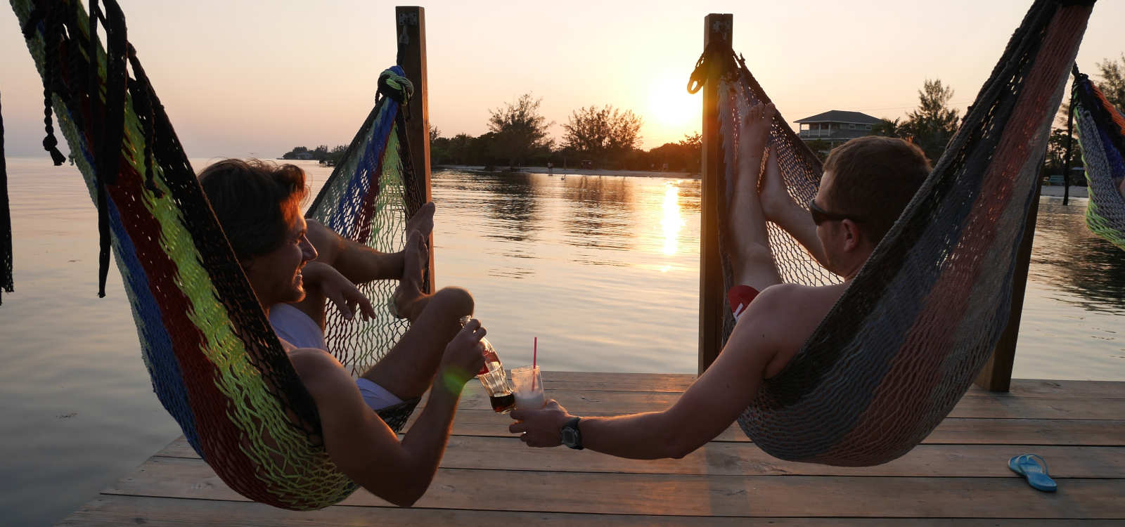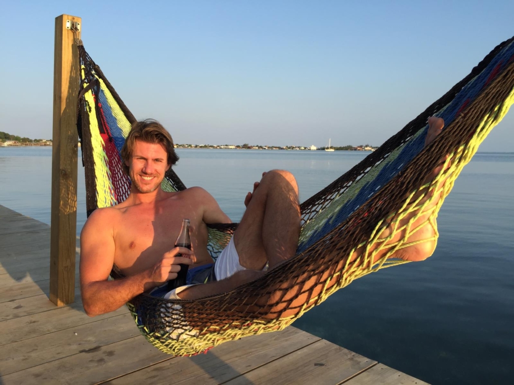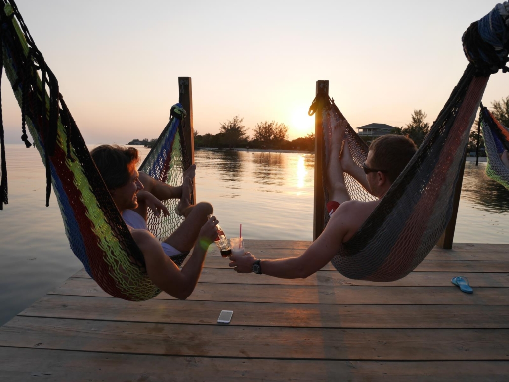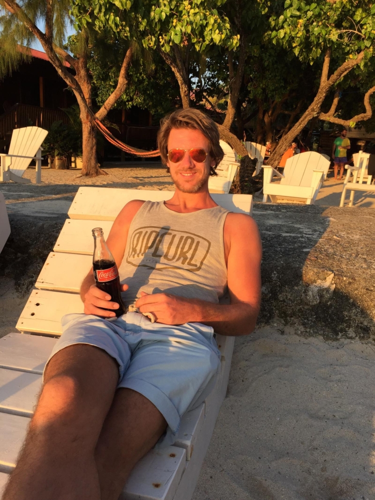 Nach dem Tauchen kann man von der Tauchbasis entweder mit dem Bus wieder zurück ins Hotel fahren oder aber zu Fuß entspannt durch das Dorf East Harbour schlendern. Das Schöne an dem System „zwei Tauchgänge vormittags“ ist, dass man den Nachmittag zur freien Verfügung hat, sprich ab jetzt ist Zeit eigentlich kein Faktor mehr. Das entspannt. East Harbour ist für mich genau das, was man sich vorstellt, wenn man an einen karibischen Ort denkt. Es gibt viele kleine Comedore, also kleine private Restaurants mit maximal 4 Tischen, in denen oft die Farbe schon ein bisschen abblättert und wo man in die Küche schauen kann. Hier und dort hört man Musik auf der Straße, sei es aus einem Wohnzimmer oder von einem vorbeifahrenden Moped mit einem auf die Rückbank geschnallten Ghettoblaster. Es gibt kleine Straßenstände, wo es selbstgemachten Schmuck oder Taschen zu kaufen gibt. Und als ich bei einer Wäscherei (zumindest vermutete ich das anhand des Schildes) meine schmutzigen Klamotten abgeben möchte, wird das einfach direkt im Wohnzimmer der Chefin Maria abgewickelt. Am nächsten Tag bezahle ich für 20 Teile 4 Dollar, während ihre Tochter gerade wieder neue Wäsche direkt im Garten aufhängt. Auf Útila läuft alles sehr entspannt ab. Auf dem Nachhause-Weg von der Tauchbasis halte ich erst bei einem kleinen Comedor an und gönne mir einen leckeren Shrimp „Po’Boy“, eine Art Sandwich. Dabei sitze ich am Straßenrand und kann dem Treiben von East Harbour zusehen – herrlich. Kennen Sie das, wenn Sie leicht gestresst auf dem Weg zu einem Termin im Auto sitzen, an der Ampel stehen und sie jemanden beobachten, der entspannt in der Sonne sitzt und in einer Zeitung blättert? Ich denke mir dann immer, das würde ich jetzt auch gerne tun! Genau diese Situation habe ich vor Augen, als ich mich mit einer schönen kalten Coca-Cola aus der Glasflasche abkühle. Nachdem ich fertig bin, schlendere ich weiter und kann der Versuchung eines kleinen Standes nicht widerstehen, bei dem es frische Smoothies gibt. Ich kann dabei zwischen allen möglichen Fruchtsorten wählen und wenig später schlürfe ich einen großen, köstlichen Ananas-Erdbeer-Smoothie für günstige 2 Dollar. An dem Crêpes-Stand ein paar Meter weiter bleibe ich kurz stehen, hebe mir das aber für den nächsten Tag auf. Man muss es ja nicht übertreiben. So geht das aber auf Útila andauernd, man lässt sich einfach inspirieren, treiben und merkt dann schon irgendwann worauf man Lust hat. Nachmittags spaziere ich mit meinem Buddy Thomas in die andere Ecke von East Harbour. Dort befindet sich der Strand der Einheimischen: kein Traumstrand, aber ein schöner, weißer Strand, an dem man herrlich relaxen kann. Unmittelbar vor dem Strand befindet sich eine der typischen Bars über dem Wasser, wovon es auf Útila so einige gibt. Das „Rehab“ ist der perfekte Ort, um ganz gemütlich auf dem Sonnendeck die Happy Hour zu genießen, denn der Blick auf das Wasser ist einfach unschlagbar. Die Bar ist eine simple Holzhütte und man wird am Eingang mit einem lustigen Schild begrüßt: Recovery ist not an option – Erholung ist keine Option. Hier hängen viele Locals, Tauchlehrer und Touristen ab, eine bunte Mischung, und genau das macht es aus. Wir legen uns nach draußen in eine Hängematte, bestellen eine Piña Colada und genießen die Atmosphäre. Vor uns liegt das Meer ganz ruhig, eine einheimische Familie paddelt in einem Kanu vorbei und das heutige Musikmotto 80er Jahre-Rock untermalt die Szene. Als die Sonne viel zu schön am Horizont untergeht, gleiten mehrere Pelikane sanft über das Meer und machen das Bild perfekt. Genau wie vorher nach dem Tauchgang, klatschen wir uns wieder ab, dieses Mal allerdings in dem wir mit unseren Cocktails anstoßen.
