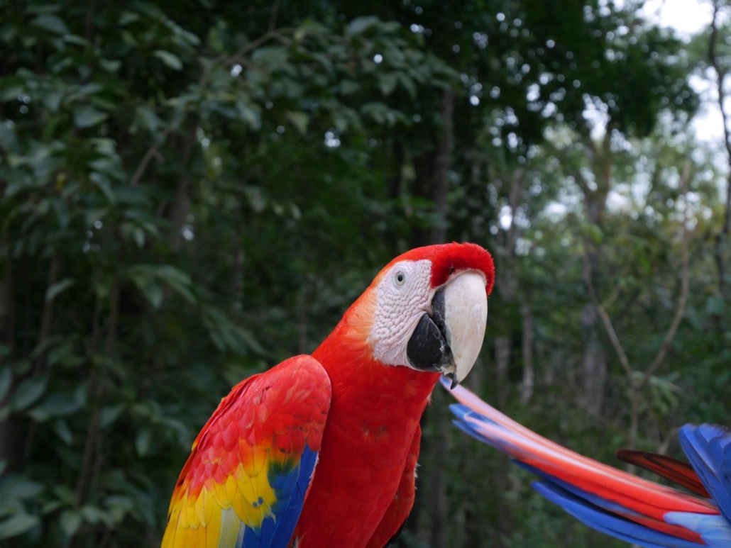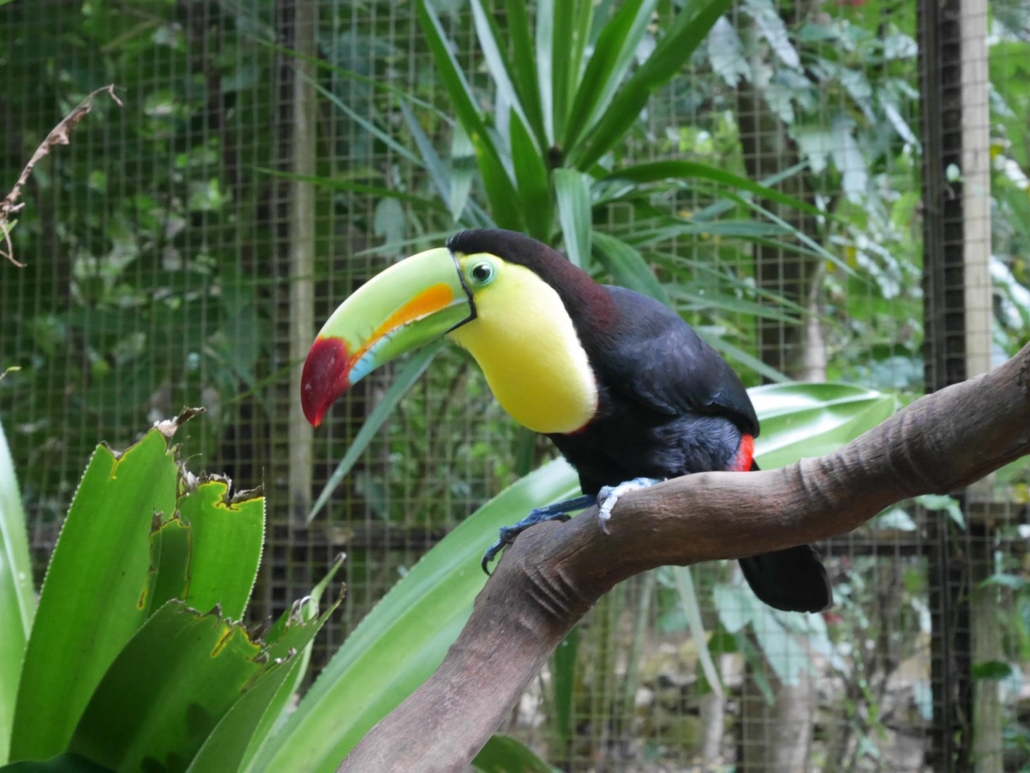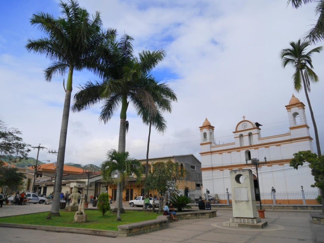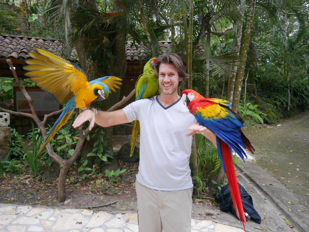 Nach unserem Rundgang durch die Ruinen der Mayastadt fahren wir zurück in den Ort Copán, wo wir ein einheimisches Restaurant mit Blick auf das Umland aufsuchen. Spezialität: Shish-Kebab. Viele aus der Gruppe bestellen genau diese Fleischspieße, die auf offener Flamme im Erdgeschoss des Restaurants gebrutzelt werden. Als diese schließlich serviert werden, erkennen die meisten, dass sie sich herzhaft übernommen haben! Die Spieße, auf denen die Fleisch- und Gemüsestücke stecken, ähneln eher riesigen Säbeln. Das Staunen ist groß, der Appetit ebenso und so stürzen sich alle, inklusive Saúl, auf das Mittagessen. Der Nachmittag steht zur freien Verfügung und während einige aus der Gruppe nochmal in die Ruinen fahren, um ein wenig ins Detail zu gehen, fährt ein anderer Teil in einen Vogelpark nahe der Stadt. Die Fahrt dorthin gestaltet sich zu einem Wettrennen, als die beiden TukTuk-Fahrer beschließen, angespornt von unserer Gruppe, sich zu „duellieren“ und brettern mit dem entsprechenden Tempo über das Kopfsteinpflaster. So bekommt jeder eine kostenlose chiropraktische Behandlung, denn es rüttelt so sehr, dass sich all meine Rückenwirbel in diesen 5 Minuten komplett neu sortieren. Der Vogelpark selbst ist ein schöner Zeitvertreib, nicht übermäßig spektakulär, aber man kann Papageien auf den Arm nehmen, was tatsächlich sehr launig ist.  Den späteren Nachmittag verbummeln wir in der Stadt Copán, denn auch hier kann man seine Zeit ganz hervorragend verbringen. Wie in den meisten Kolonialstädten gibt es einen typischen mittelamerikanischen Marktplatz mit einer Kathedrale und sternförmig darauf zulaufende Kopfsteinpflasterstraßen. Kleine Garküchen grillen Maiskolben, echte Cowboys sitzen auf Bänken und kauen auf Gräsern herum und ein paar Kinder versuchen dezent handgemachte Souvenirs loszuwerden. Erfreulicherweise sind sie aber nicht aufdringlich, sondern lassen sich argumentativ mit einem „no gracias“ überzeugen. Es kommt einem vor, als ob der Ort vom Tourismus gelesen hätte, aber in der Praxis noch nicht genau weiß wie er funktioniert. Auf Saúls Empfehlung trifft sich die Gruppe in einem schönen Café wieder und alle genießen einen grandiosen einheimischen Kaffee, um sich anschließend damit kiloweise für zu Hause einzudecken.