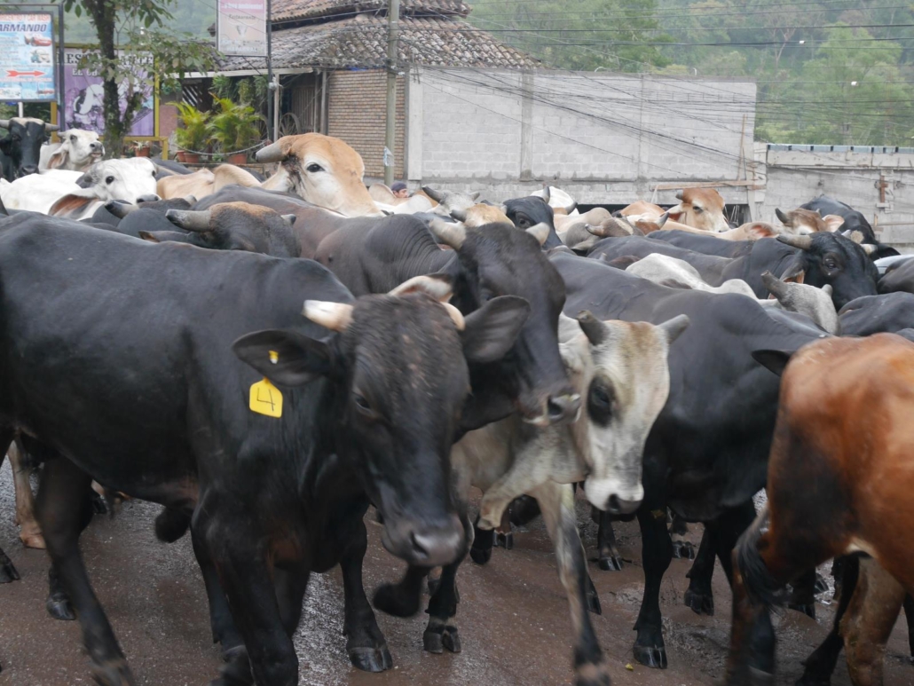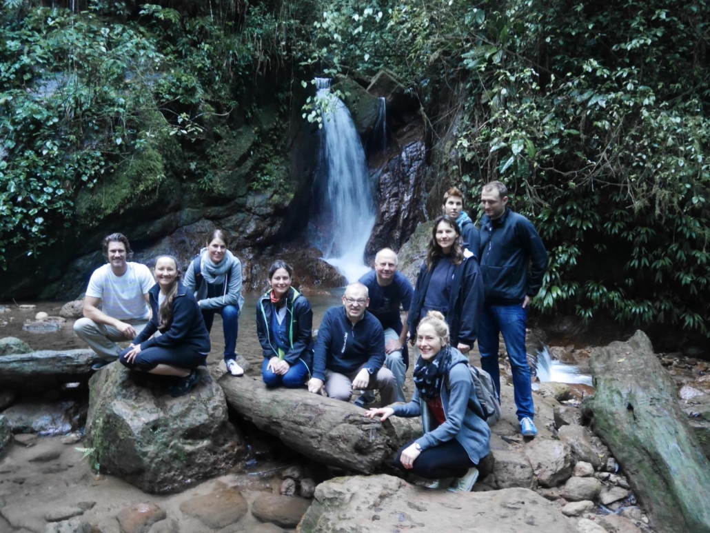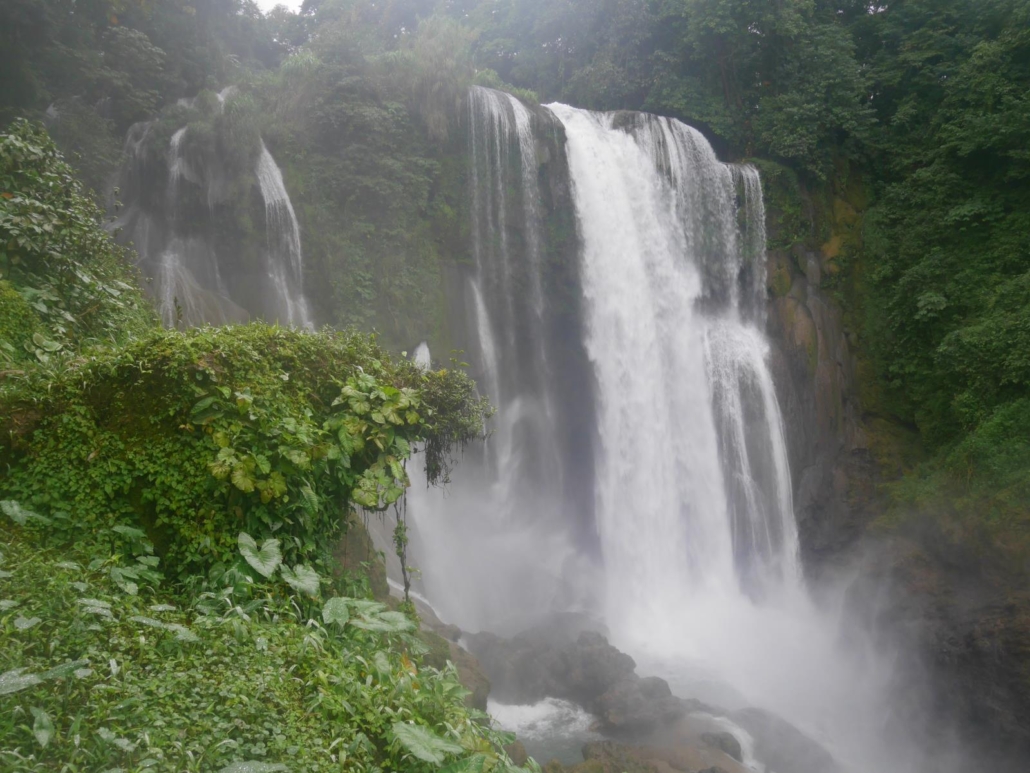 Am nächsten Morgen brechen wir nach einem kurzen Marktbesuch Richtung Nationalpark Azul Meambar auf. Beim Verlassen von Copán testen wir unfreiwillig nochmal die Bremsen unseres treuen Busses, denn die Stadt ist wie oben schon erwähnt extrem hügelig und als wir eine stark abfallende Straße herunterkriechen, bin ich mir sicher, dass der eine oder andere beim Blick aus dem Frontfenster hinab in die Straßenschlucht die Finger überkreuzt hat. Ein bisschen Abenteuer gehört aber natürlich mit dazu und ist im Preis mit inbegriffen. Unsere Fahrt zum Nationalpark ist dann wieder eine Sightseeing-Tour durch die Natur und das Leben von Honduras. Eigentlich passiert draußen immer etwas, wie zum Beispiel als uns eine kapitale Kuhherde die Straße blockiert. Flankiert von reitenden Cowboys mit angeschnallten Mantaletten, finden die erstaunlich leichtfüßigen Kühe dann aber doch den Weg um unseren Bus herum. Ansonsten sieht man Palmen, Bäume, Sträucher, meterhohe Zuckerrohrpflanzen, Ananas- oder Bananenplantagen soweit das Auge reicht. Dazu streunen Esel, Schweine, Rinder und Pferde am Straßenrand herum. Man kann sich kaum satt sehen an den vielen Pflanzen und Tieren – zumindestens geht es mir so. Um sich zwischendurch ein bisschen die Beine zu vertreten, machen wir Station am größten Wasserfall des Landes, nämlich dem Pulhapanzak, der immerhin eine Wasserfallhöhe von 43 Metern aufweist. Die Aussicht alleine ist schon spektakulär, aber das Highlight ist sicherlich die Möglichkeit, an Drahtseilen über den Wasserfall zu sausen. Canopy nennt sich der Spaß und ist wirklich eine faszinierende Angelegenheit. In 12 Stationen rutscht man gut gesichert und frei schwebend im zickzack über den Fluss und zum großen Finale dann auch wirklich über die Kaskade des Wasserfalls. Schon alleine das Zuschauen ist aufregend. Zu unserer Lodge im Nationalpark müssen wir noch ein paar Höhenmeter überwinden bzw. quält sich unser Bus die Steigungen der Gebirgsstraße hinauf. Als wir oben ankommen, sieht aber jeder sofort, dass sich die Fahrt gelohnt hat, denn wir befinden uns mitten im vollkommenen Grün. Unsere Lodge liegt wunderschön an einem Hang mit sensationeller Aussicht über ein weites Tal und verfügt über einige Bungalows mit geräumigen Zimmern und großzügigem Balkon. Schnell einigen wir uns auf einen erfrischend frühen Termin für den nächsten Morgen, um bei der Wanderung vor dem Frühstück möglichst viel zu sehen. Um 5.45 Uhr startet unsere Tour durch den Dschungel des Nationalparks Azul Meambar und wir sind uns danach eigentlich alle einig, dass man hier sicherlich noch sehr viel mehr Zeit hätte verbringen können. An einem kleinen Wasserfall im Nationalpark wollen wir schließlich ein schönes Gruppenfoto machen und hier zeigt sich zum ersten Mal eine Schwäche von Saúl, denn Fotos machen kann er leider nicht. So ist unser ambitioniertes Bild vor dem Wasserfall leider stark verwackelt, aber man kann wohl nicht alles haben.