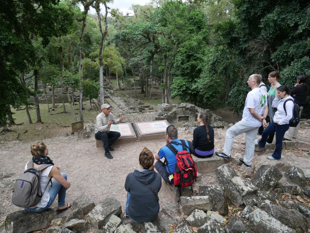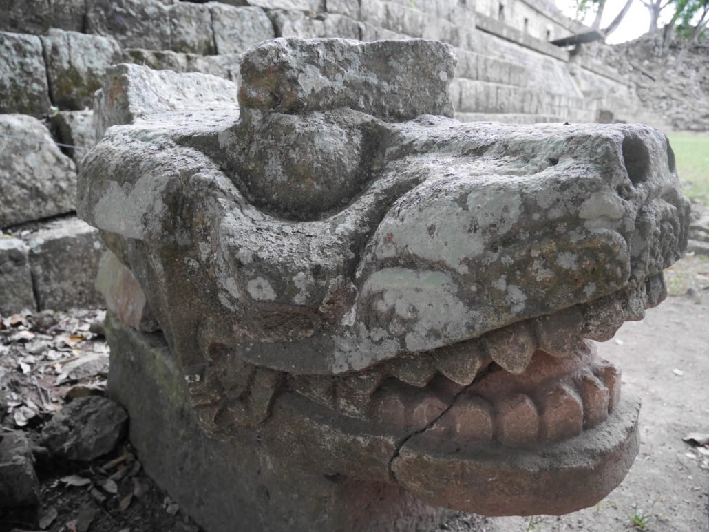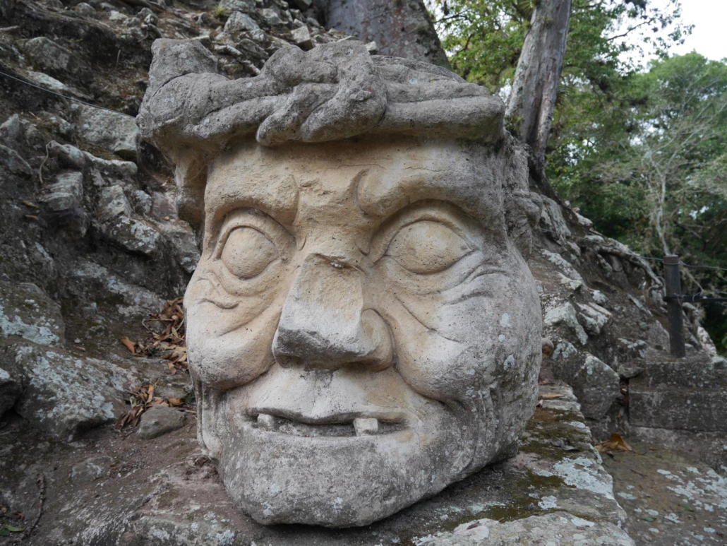 Das Frühstück am nächsten Morgen ist großartig, typisch honduranisch mit Empanadas, Früchten, Eierspeisen, dazu Müsli und ein paar süße Leckereien. Gestärkt und äußerst motiviert brechen wir Richtung „Copán Ruinas“ auf. Auf dem Weg dorthin machen wir noch kurz Halt auf einer Anhöhe, denn der Ort Copán liegt leicht kesselartig in einem Tal und wir können von dort oben wunderschön die Häuser und die umgebende Landschaft betrachten. Einzig die Sonne will sich nicht zeigen, aber das tut meiner Vorfreude keinen Abbruch. Als wir bei Copán Ruinas ankommen, bin ich direkt beruhigt, denn es stehen tatsächlich wieder nur zwei kleinere Busse auf dem Parkplatz. Bei einer vergleichbaren Anlage in Mexiko wäre es eine vielfache Anzahl und entsprechend wäre der Rummel rund um den Eingang. Es gäbe Plakate, Souvenirverkäufer und sich aufdringlich anbietende Tourguides. Hier ist das nicht so, alles wirkt immer noch sehr ruhig und wirklich nahezu untouristisch. Saúl geht vorne weg , erklärt uns das Areal und glänzt erneut mit allerhand Informationen. Ich habe ja schon einige Reiseleiter erlebt und weiß aus eigener Erfahrung, dass man hier und da mit seinen Gedanken abschweift, weil man den historischen Geschichten nicht mehr folgen kann, aber Saúl ist ein Künstler. Niemand dreht sich wie früher in der Schule gähnend zur Seite, sondern jeder hört ihm zu und beobachtet ihn, wie er mit Händen, Füßen und seinem ausdrucksstarken Gesicht erzählt. Besonders viele Lacher hat Saúl auf seiner Seite, als er erklärt, dass die Mayas ein ziemliches Partyvolk gewesen sind, denn es gab in ihrem weltbekannten Kalender oder generell in ihrem Alltag anscheinend sehr viele Anlässe für eine ausschweifende Fiesta. Drogen und unterschiedlichste Rauschzustände waren dabei wohl ziemlich normal. Saúl berichtet auch, dass die „Upper Class“ der Mayas speziell geformte Gesichter und Köpfe hatten, die durch eine Art Maske schon im Kleinkindalter geformt wurden. Und tatsächlich, sofort habe ich die harten Kanten in den Gesichtszügen der Mayas vor mir – zumindestens die, die ich aus Filmen oder Dokumentation kenne. Spannend. Schließlich erkunden wir das Gelände von Copán und es hat nichts von seiner Atmosphäre eingebüßt. Zu gerne würde ich einmal diese ehemals so prachtvolle Mayastadt bei Sonnenschein fotografieren, denn die Motive springen einem fast in die Kamera. Vor allem die dicken und mammutartigen Bäume, die teilweise wie Filmkulissen auf den Felsen Wurzeln schlagen, sehen im Kontrast zu den akribisch angelegten Mauern einzigartig aus. Überall findet man Inschriften, Statuen, Figuren, Tempelstufen und natürlich auch große Grünflächen, die früher wohl Marktplätze oder Zuschauerbereiche waren. Mittlerweile kann man auch viele frei umher fliegende Papageien auf dem Gelände beobachten, die natürlich ebenfalls ein tolles Fotomotiv abgeben.