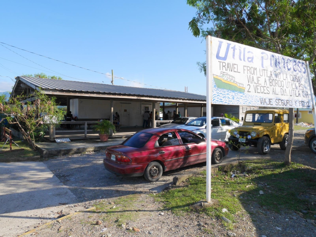 Auf der Weiterreise zum Hafen von La Ceiba, wo wir die Fähre nach Útila nehmen werden, machen wir noch einmal kurz Halt an einer Art Obststand am Straßenrand, bei der man alle möglichen Früchte kaufen kann. Obwohl die Ananas köstlich aussehen entscheide ich mich für Süßbananen und eine Kokosnuss, genau wie einige andere, und so gibt es ein fröhliches Gemampfe auf der Weiterfahrt. Der Hafen von La Ceiba ist ehrlich gesagt eine Show, denn die Unterschiede der verschiedenen Hafenbereiche könnten nicht größer sein. Auf der einen Seite befindet sich das Terminal für die Fähre nach Roatán, welches die größte und touristischste Insel des Landes ist. Dabei handelt es sich um ein großes, modernes Gebäude mit großen Fensterfronten und Klimaanlagen, alles in allem ein schickes Bauwerk für den klassischen Touristen. Auf der anderen Seite findet man umringt von klapprigen Autos und rostigen Fahrrädern ein deutlich kleineres  und rundherum offenes Bretterhaus mit nur einem Ticket-Schalter, nämlich das Terminal für die Fähren nach Útila. Bereits hier kann man erkennen, dass nach Útila ein ganz anderer Schlag Urlauber reist! Das gleiche Bild setzt sich übrigens bei den Fähren selbst fort: die „Roatán Galaxy“ wirkt imposant und luxuriös, während die „Útila Princess“ ein wenig an ein flunderähnliches Raumschiff  aus den Neunzigern erinnert. Wir steigen in die Flunder ein und sind anderthalb Stunden später auf der Backpacker-Insel Útila.