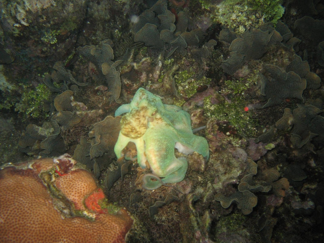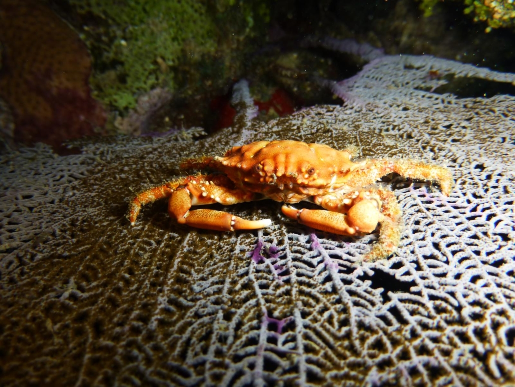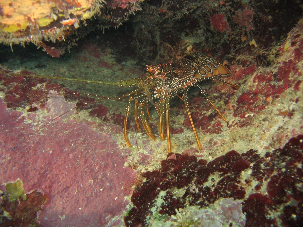 Als wir zu unserem Tauchgang starten, informiert uns Mike, dass wir an einer Steilwand tauchen werden, die direkt an der Boje eine Art Canyon, der teilweise sogar zu einem Tunnel wird, zu bieten hat. Dieser startet bei 5 Metern und man kommt bei ungefähr 25 Metern heraus! Eine Spitzensache, solche Feinheiten der Riffbeschaffenheit sind genau mein Wetter, das macht mir richtig großen Spaß. Das Schöne bei den Tobri Divers ist außerdem, dass sich das Resort fast mittig auf Roatáns Südseite befindet, also dort wo man die spektakulären Steilwände vorfindet, genau wie an unserem Tauchplatz Lita’s Hole. Die Ausfahrten dauern je nach Tauchplatz nur 5 bis 30 Minuten, was auf Roatán das Beste ist, was man bekommen kann. Ich hüpfe schnell rein ins Wasser, um den Canyon noch ohne aufgewirbelten Sand zu erleben, allerdings hatten diese Idee alle anderen ebenfalls. Bis auf meinen Buddy Thomas, der in aller Ruhe seine Kamera und sein Equipment zusammenschraubt, so dass wir schließlich als letzte durch den Riffspalt tauchen. Egal, es gibt keine Probleme nur Lösungen, insofern warten wir nach dem letzten Taucher noch ein bisschen und checken derweil das üppig bewachsene Korallendach auf 5 Metern Tiefe. Hier lässt es sich gut austauchen, soviel ist sicher. Als wir schließlich in das Loch hinabsinken erkennen wir den tiefen Riss im Riff, der einen grandiosen Canyon bildet. Teils ist es ganz hell und die Sonne blitzt hinein, teils wird es etwas dunkler, wobei immer genügend Licht bleibt, so dass man keine Lampe braucht. Ein paar silbrige Fische versperren uns erst den Weg, geben diesen dann aber doch frei und wir können schwebend die Felsen hinter uns lassen, um ins blaue Nichts hinaus zu tauchen. Super Start! Wir tauchen mit der linken Schulter am Riff weiter und die Steilwand ist wirklich steil, oft hat es sogar Überhänge, wodurch sich viele Höhlen ergeben, die Unterschlupf für unzählige Lobster, Muränen und jede Menge Kleinfisch bieten. Einmal zeigt  Mike auf einen Spalt, in dem sich 4 Lobster um den besten Platz drängeln! Auch Michaela, unser Trüffelschwein, schlägt wieder zu, denn  sie entdeckt auf für mich unverständliche und magische Weise einen Drachenkopf, den ich selbst aus kürzester Distanz kaum zu sehen vermag. Die Steilwand ist – genau wie alle anderen auf Roatán auch – vielfältig bewachsen und bietet allerhand Möglichkeiten diesen Tauchplatz immer wieder neu zu erforschen. Auf dem Rückweg schaut Mike meinen Buddy Thomas und mich an und kippt seinen Kopf nach links unten. Zuerst verstehe ich nicht genau was er meint, aber dann schalte ich doch noch. Wir tauchen nochmal ab und erkunden den Tunnel dieses Mal in umgekehrter Richtung. Großartige Idee! Als wir am Eingang des Canyons angelangt sind, entdecke ich endlich auch mal etwas. Weiter unter uns bewegt sich etwas Großes. Etwas dunkles, flatterndes. Ein Adlerrochen zieht ganz gemütlich an uns vorbei, allerdings wie gesagt leider unterhalb von uns. Dennoch, eine tolle Sache und ein schicker Sondervermerk in meinem Logbuch. Wir tauchen Lita’s Hole nochmal nach oben und genießen dieses Mal die Exklusivität des Erlebnisses. Ein klasse Tauchplatz. Mike hat in der Nähe seines Resorts viele Tauchspots dieser Qualität und das Schöne ist, viele werden fast nur von ihm und seinen Gästen besucht. Die meisten Tauchschulen befinden sich nämlich entweder in Westend und damit zu weit westlich oder aber nahe der Stadt French Harbour und damit zu weit östlich. Ein unschätzbarer Vorteil!