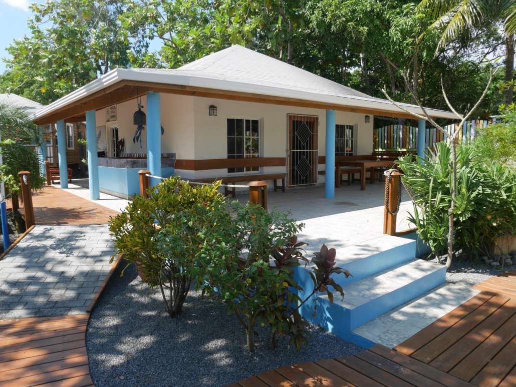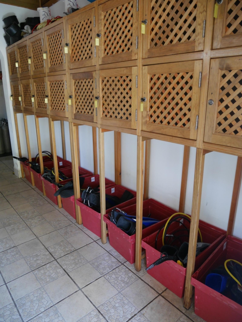 Bei der Ankunft im Tobri Divers Resort sehe ich viele strahlende Gesichter. Und das zu Recht! Dieses Hotel ist eine Perle für Taucher. Man merkt: hier waren Taucher am Werk und haben alles auf das Tauchen ausgerichtet. Ganz generell, die Tobri Divers verfügen über 6 Zimmer, wobei 5 davon eine jeweils unterschiedliche Zimmerkategorie haben – ähnlich wie im Mango Inn auf Útila. Die einfachste Kategorie ist der Survival Bungalow, der als Zimmer kompakt und schön ist, sich aber vor allem durch kaltes Duschwasser auszeichnet. Dafür ist er aber auch erheblich günstiger als die anderen Möglichkeiten. Des weiteren gibt es zwei Zimmer im Haupthaus mit seitlichem Meerblick und eines mit direktem Meerblick, einen Bungalow und ein Penthouse, welches quasi ein Appartement mit riesiger Dachterrasse ist. Alle Kategorien haben etwas für sich und sind preislich fair gestaffelt. Die Tauchbasis befindet sich zentral im Hotel und da gehen die dicken Pluspunkte auch schon los. Die Tauchbasis ist sehr geräumig angelegt, jeder hat ein Schließfach und es gibt genügend Platz um seine Sachen drinnen und draußen aufzuhängen. In der Praxis hängt man nach dem Tauchen seine Klamotten draußen zum trocknen auf und abends wird das Equipment vom Staff hinein geräumt. Das ist schlichtweg ideal in meinen Augen. An der Tauchbasis gibt es eine große Tauchplatzkarte und daneben werden immer wieder die angefahrenen Tauchplätze samt Tauchgangsdaten eingetragen, so dass jeder sein Logbuch befüllen kann, wann immer er lustig ist. Das aufgebaute Equipment wird vom roten „Ferrari“, einem rot angemalten Wägelchen, nach vorne zum hauseigenden Pier gefahren und dort ins Boot verladen. Das ist durchdacht, das ist angenehm und jeder hat jederzeit alles im Blick. Mike oder Susan machen entweder an der Basis oder am Tauchboot ein ausführliches Tauchplatzbriefing anhand einer selbstgemachten Karte, so dass man immer weiß, was einen erwartet. Die Waschbecken sind auch groß und immer sauber, so dass es hier, was die Tauchbasis angeht, nichts aber auch gar nichts zu Meckern gibt. Das ist tiptop, spitzenklasse. Ich muss mich für die Superlative entschuldigen, aber genau so habe ich das Tauchen bei den Tobri Divers empfunden. Als typisch Deutscher gibt es natürlich trotzdem einen Punkt, der mir aufgefallen ist. Der Schritt ins oder aus dem Boot hinaus, sprich über die Bootskante hinaus, ist einen Tick zu groß bzw. hoch. Das ist aber Nörgeln auf verdammt hohem Niveau.