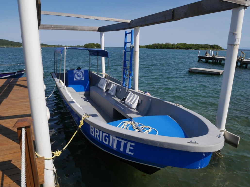 Am nächsten Morgen werden wir vom Bus des Hotels zur Tauchbasis gefahren, auch wenn man die Strecke in 10 Minuten gehen könnte. Aber gerade am ersten Tag mit Equipment ist es so natürlich deutlich angenehmer. Die Tauchbasis Útila Dive Center wirkt ein bisschen wie der Hafenbereich aus der Serie „Flipper“, denn es ist alles aus Holz. Das einstöckige Haus, der Boden, die Bar, der Kompressorraum, der Steg, der Equipmentraum und die Sitzecke auf dem Steg. In der Mitte wächst ein großer Baum durch in die Höhe, was dem ganzen noch ein bisschen mehr Charme verleiht. Zur Hauptzeit ist es in der Tauchbasis schon mal etwas wuseliger, wenn alle Taucher kreuz und quer laufen, aber auf Útila wird das positiv mit „lebendig“ umschrieben. Es gibt insgesamt vier Tauchboote, die allesamt gut ausgestattet und aufgrund ihrer quietschgelben Farbe sofort erkennbar sind. Als wir an Bord der „Old Tom“ gehen, bekommen wir von Hannah ein ausführliches Boot-Briefing und, wie anscheinend auf Útila üblich, wird auch der Captain vorgestellt. José ist sicherlich der coolste Kapitän, den man sich vorstellen kann, denn er hat die Statur eines Sumo-Ringers und eine maximal lässige Ausstrahlung. Man würde ihn wild gestikulierend in einem Hip-Hop-Video mit dicken Goldketten vermuten, dabei hat er das Gemüt eines Teddy-Bärs.