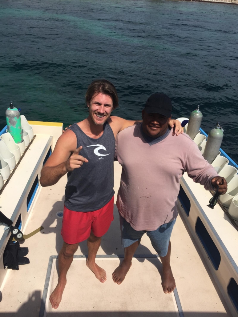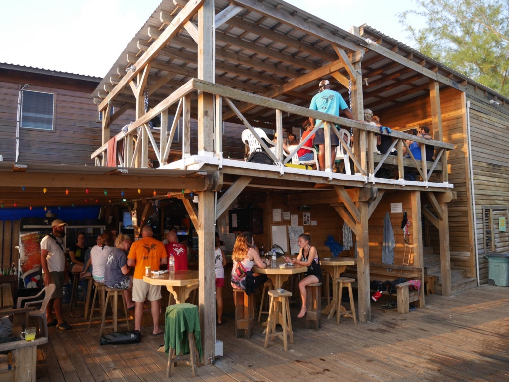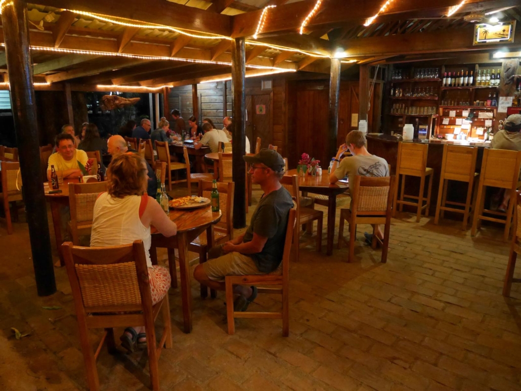 Direkt am ersten Tag noch bekommen wir beim Abendessen Besuch aus der Tauchbasis und unsere beiden Divemaster für die kommende Woche stellen sich vor. Hannah und Mary, haben die Insel offensichtlich schon völlig verinnerlicht, denn wirkliche Probleme oder gar Stress gibt es bei ihnen nicht. Ich finde diese Regelung zwischen Hotel und Tauchbasis großartig, denn so erfolgt das Tauchbasen-Briefing gemütlich bei einer Shrimp-Pizza und nicht hektisch morgens an der Tauchbasis, wenn eigentlich nur jeder schnell sein Geraffel zusammenbauen will. Noch dazu genießt so jede Frage volle Aufmerksamkeit, was ja auch nicht verkehrt ist.